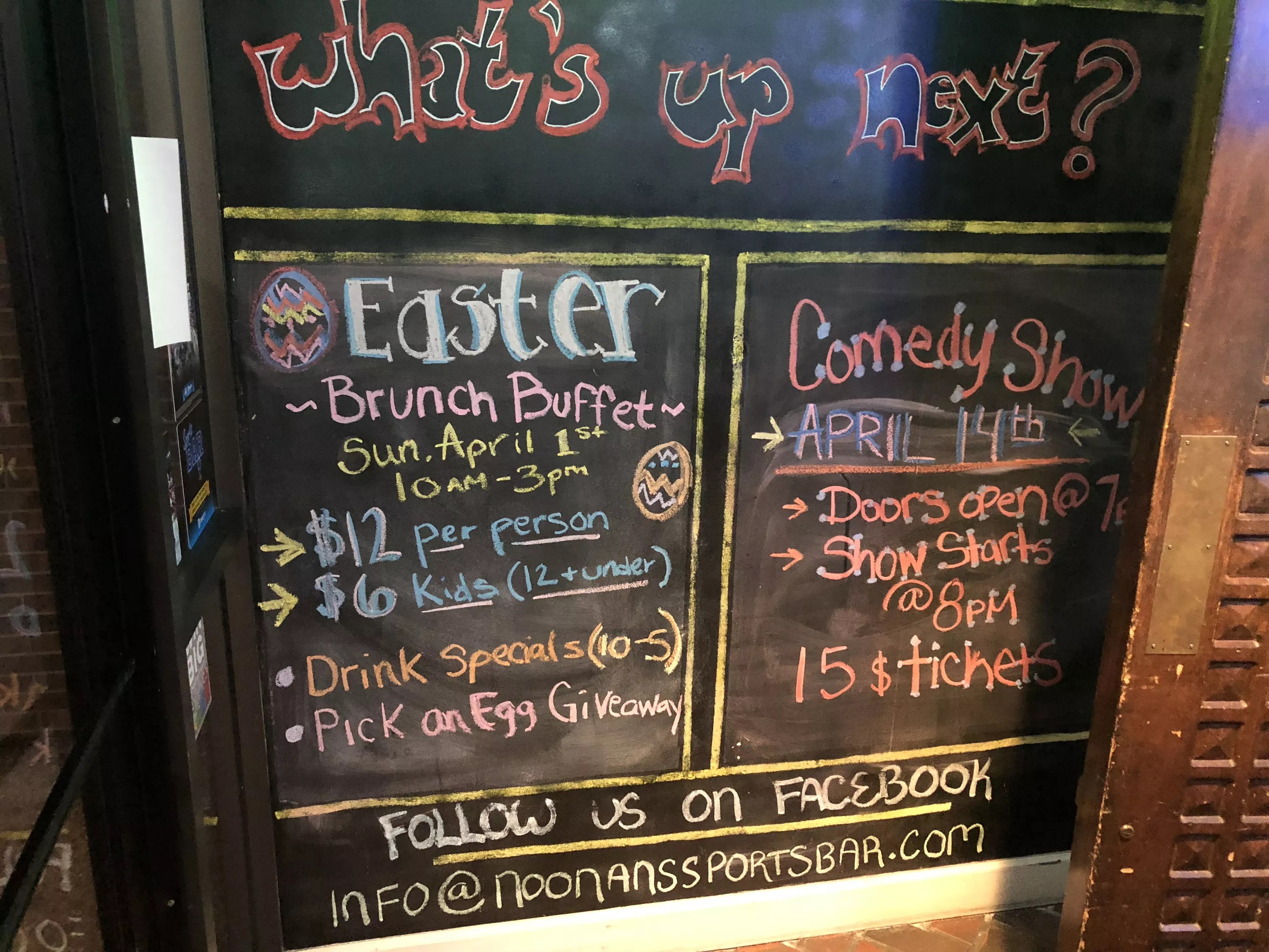 Our waitress, a newcomer to the joint, told us what she knew about Noonan’s, which proclaims itself the spot “where there’s always something happening!” The statement seems accurate, given all the chalkboards announcing holiday buffets, comedy shows and events, and specials every night of the week, including karaoke, Texas Hold ‘Em poker tournaments, trivia, beer pong and bingo.