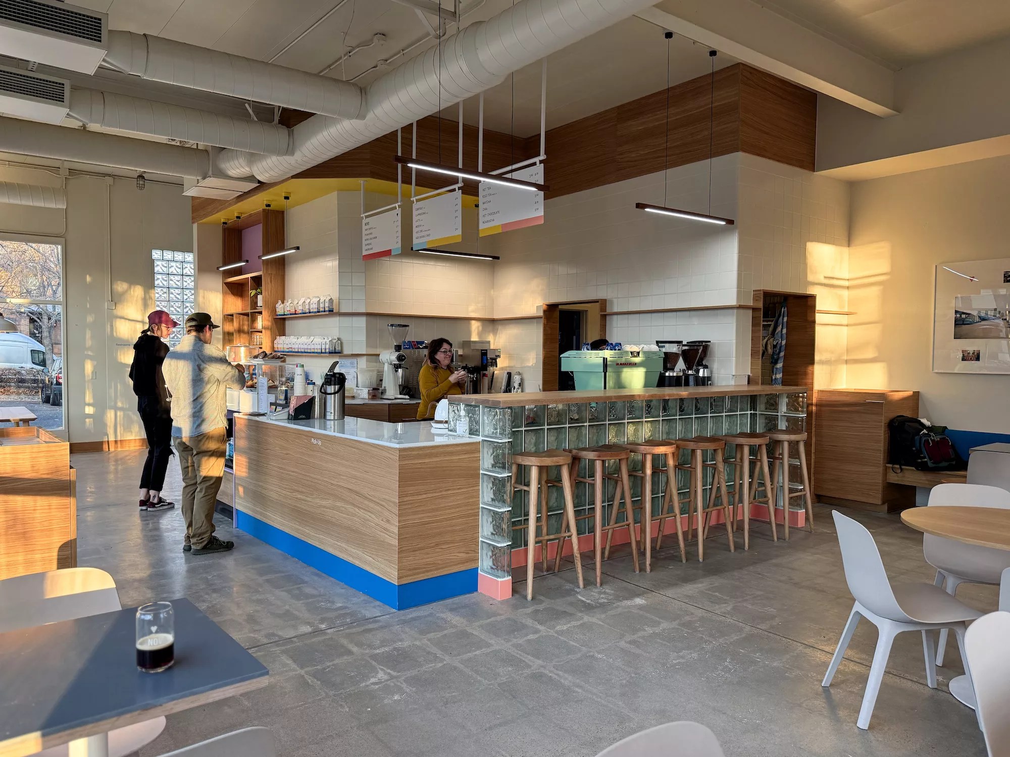 The company recently rebranded and took the opportunity to incorporate some of its new bright color palate into the 1,200-square-foot space. The paint, accentuated by natural light from two glass garage doors makes for a vibrant place to enjoy a pour over; a housemade chai; a latte made with rotating, single-origin espresso; or employee-concocted seasonal beverages.