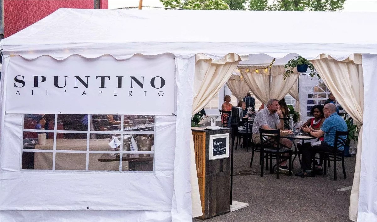 The old brick warehouse and modern hotel that comprise the Source house several restaurants, so the market hall has converted its Brighton Boulevard-facing parking pad into Out Source, a collection of well-spaced geodesic domes intended for sheltered outdoor dining every Saturday and Sunday this summer. Guests are seated by a host and can then order food and drinks from Acorn, Reunion Bread, Grabowski’s Pizza, Safta or Smok. Visit the individual restaurants’ websites for reservation policies and menu details. Smok has also expanded its own outdoor seating onto the grassy area near the market hall’s walkway to provide open-air service with “a human connection.” Spuntino’s semi-permanent tent is ready for guests. Courtesy of Spuntino