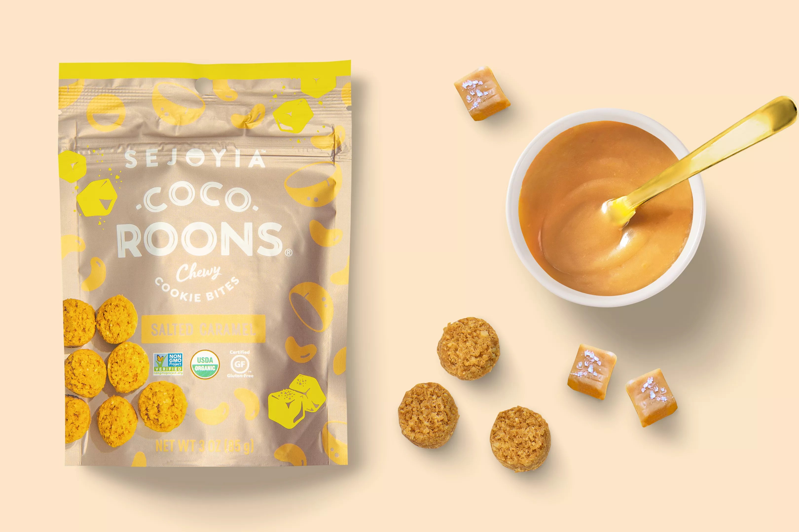 In this case, mindfully made adds up to nothing more than coconut, cashews, coconut sugar, sea salt and flour created from cassava, a root vegetable found in Latin American, Asia and Africa that’s gluten-, grain- and nut-free. The soft, macaroon-like cookie bites come in flavors such as salted caramel, lemon pie, maple vanilla and chocolate chip. The newly launched crispy Coco-Thins come in vanilla, chocolate, lemon and salted caramel. All of the cookies are vegan, kosher, non-GMO certified, gluten-free and paleo-friendly. Sejoyia salted caramel Coco-Roons. Sejoyia