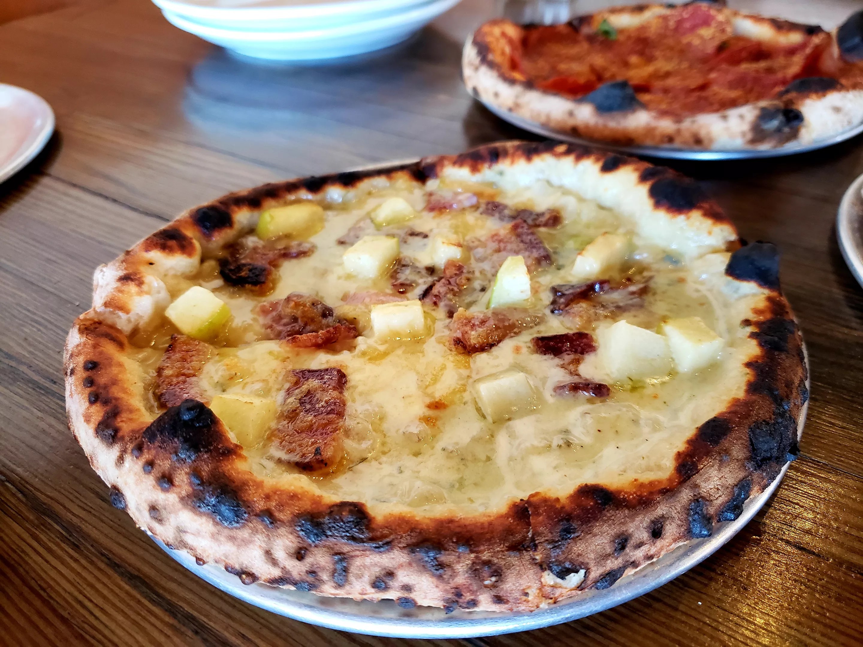 The Mela pizza at Peel Handcrafted Pizza has apples, Point Reyes blue cheese, aged cheddar, parsley cream sauce and Tender Belly bacon.