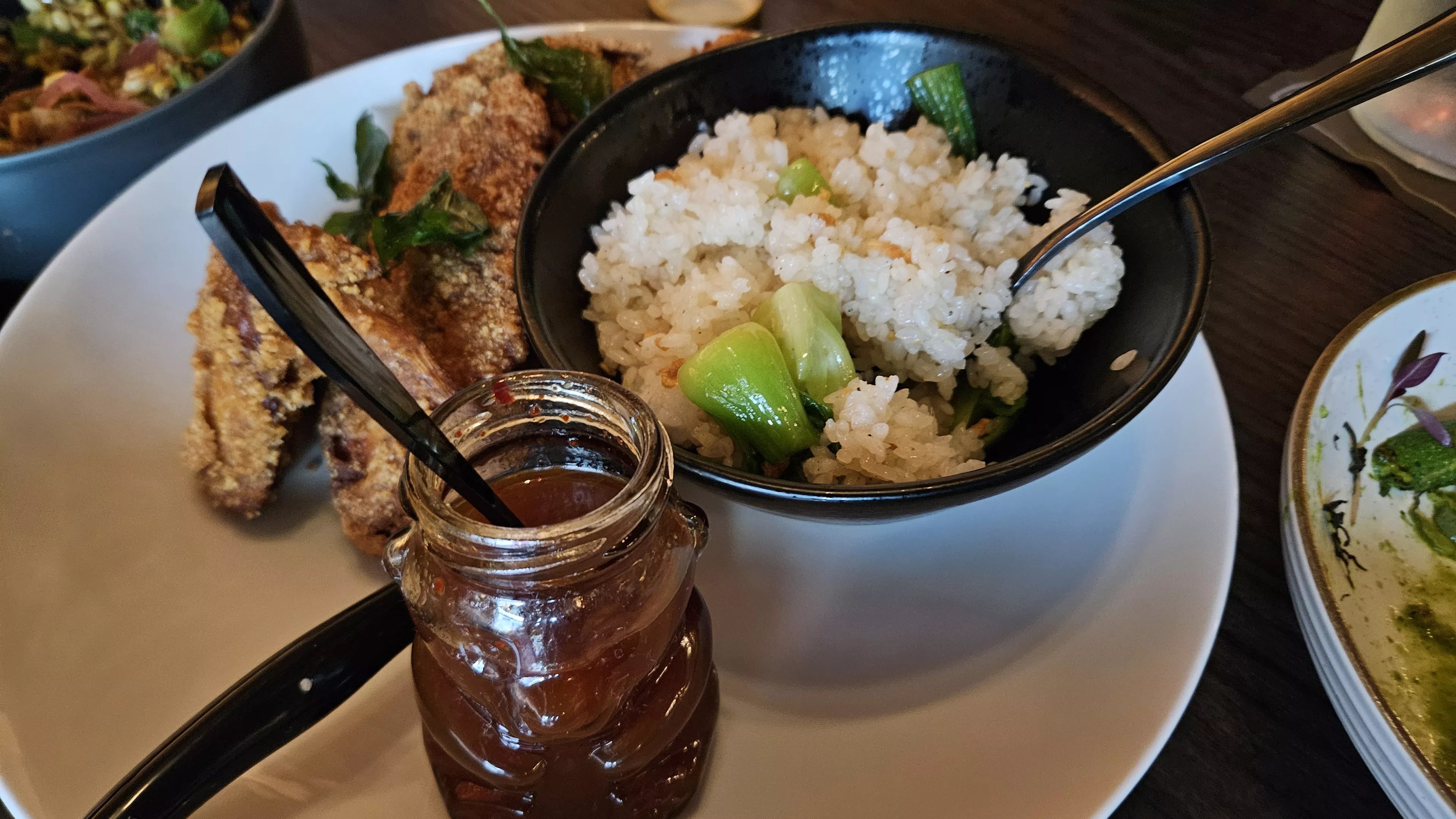 Taiwanese fried chicken with chicken fat rice and chili honey that adds an extra note to the crispiness of the chicken.