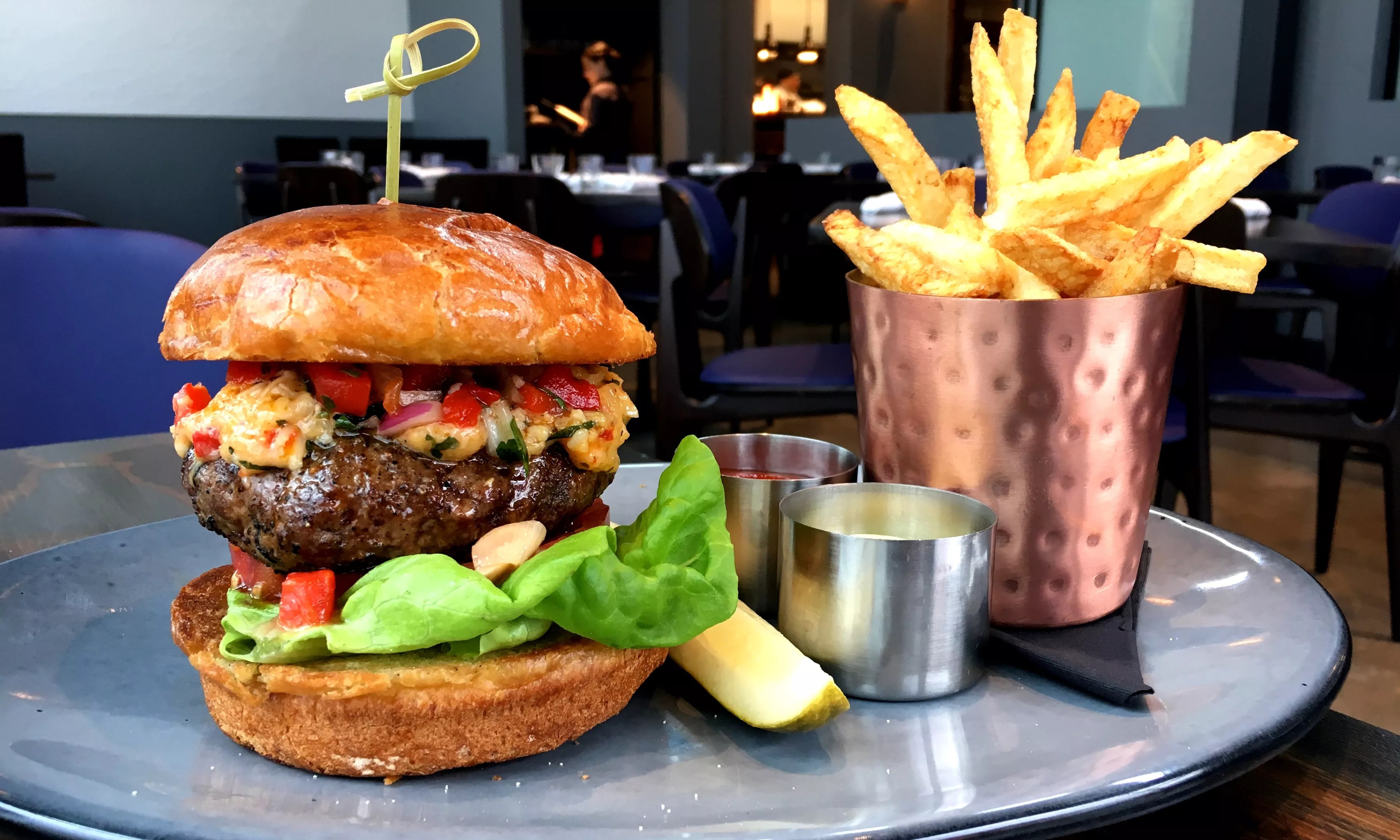 Slaughter has owned and operated Tribe Tattoo, on the same block as Pistol Whip, for nearly two decades, but he didn’t want his restaurant to look like his tattoo studio. Instead, the new space is airy and modern, combining the ambience of a posh downtown eatery with that of an upscale sports bar. So you’ll find big TVs above the bar, and high-top tables with metal stools, but surrounding the bar are racks of wine bottles, gilt-framed mirrors and plush captain’s chairs upholstered in royal blue.