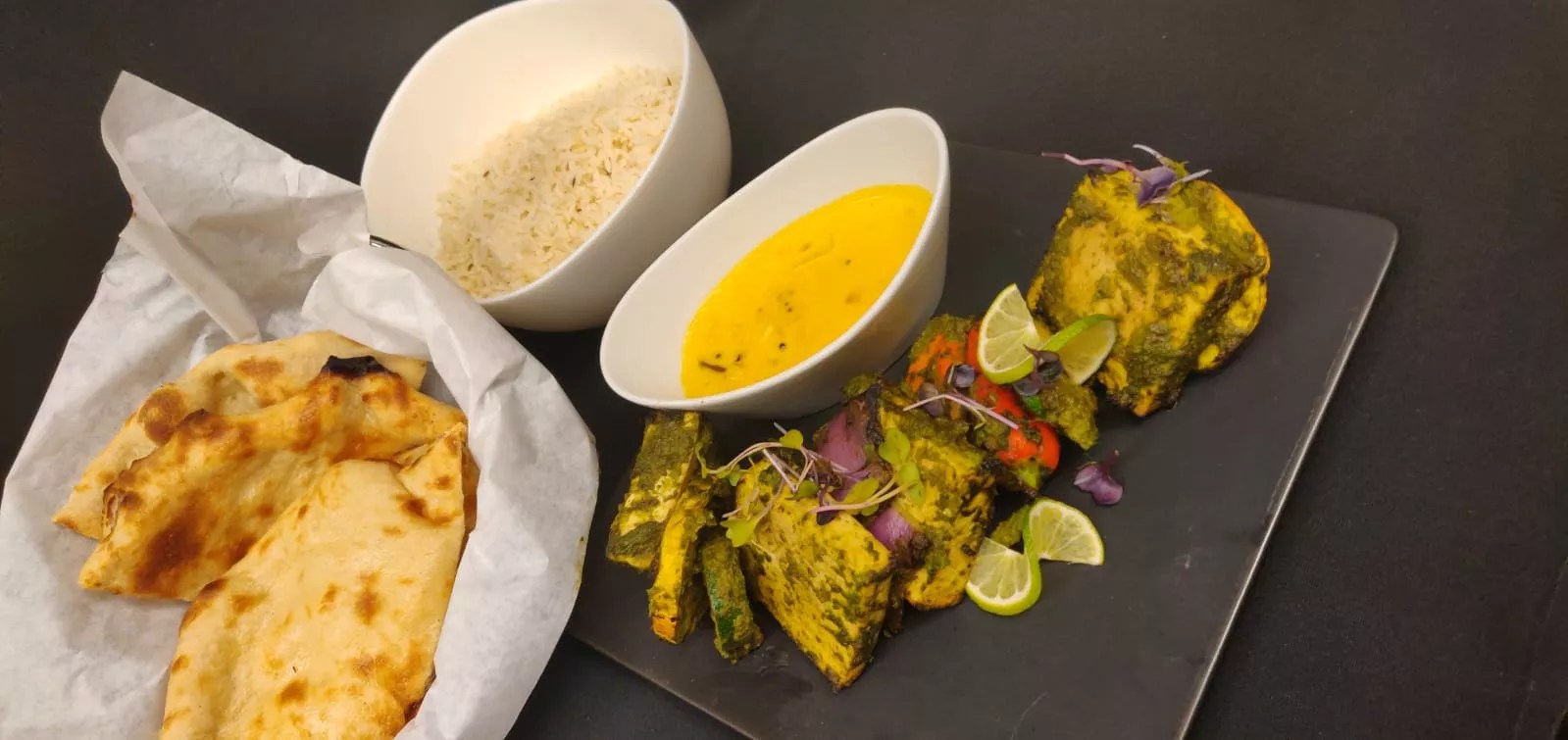Two first-course options are gluten-free artichoke pakora (crispy artichoke fritters with chutney), or jackfruit pav bhaji (pulled jackfruit, a winter spice blend, chili and naan wedges). The second course is a gluten-free basil-marinated tofu and vegetables with spiced coconut crème served with basmati rice and naan. A vegan chocolate raspberry cake provides a delicious sweet ending.