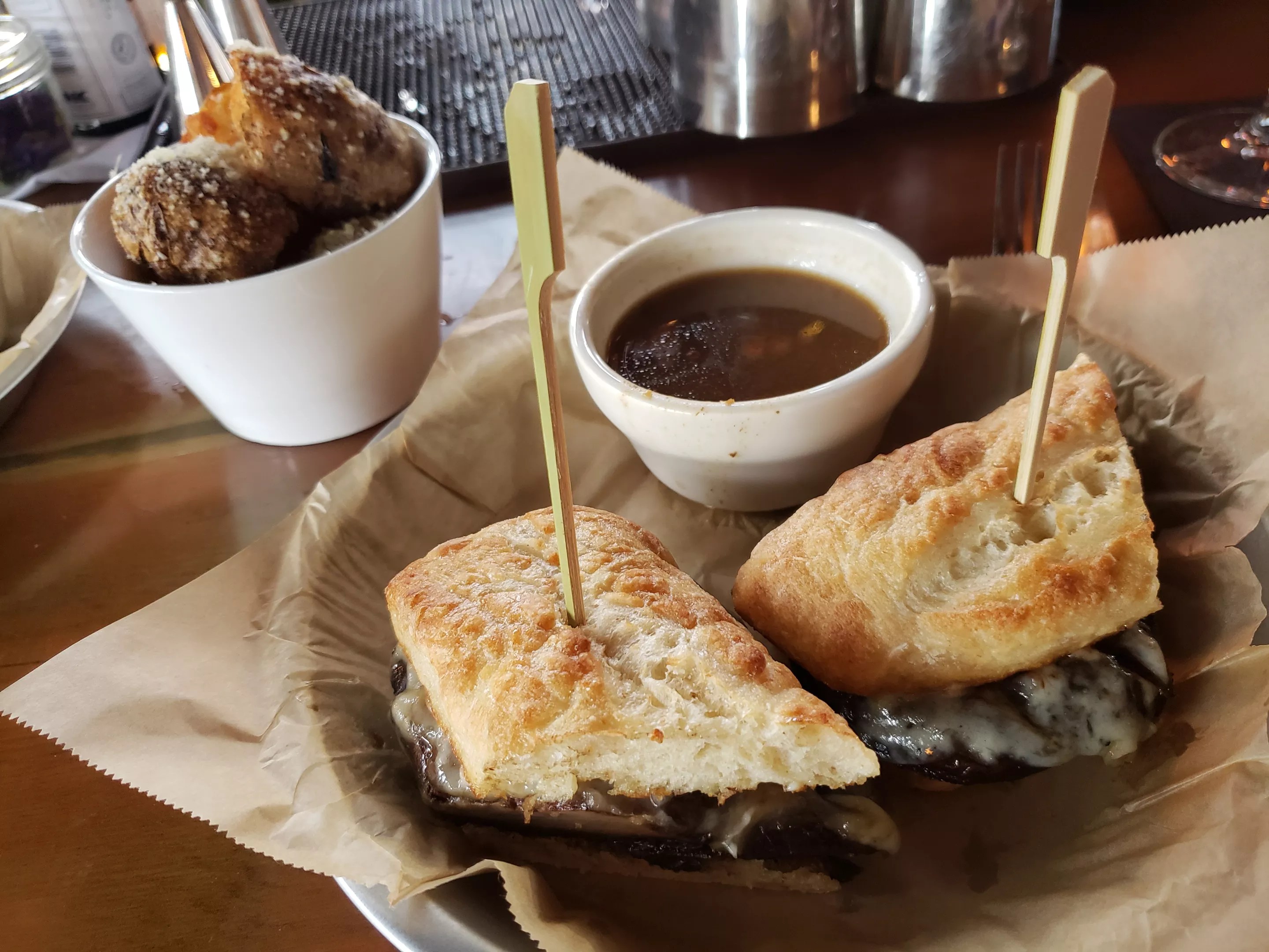The chef will complement the cocktail roster with bar bites in the form of chicken karaage (Japanese fried chicken), wings with creamy Point Reyes blue-cheese dressing and crispy potatoes, which Feeley makes by roasting whole russets and then “hand breaking” them before they go in the fryer, resulting in a crispy-meets-creamy texture. There will also be the list of dip sandwiches, including his take on the French dip, called the Ord Street Classic; an agedashi tofu dip with Kewpie mayo; the Frenchie, which has shaved prime rib, Gruyère cheese, thyme, crispy shallots and a French onion soup dip; and the Mellow Mushroom, a vegetarian version stuffed with pecan-smoked portabellos, Swiss cheese and a rich porcini broth. The Mellow Mushroom, a pecan-smoked portabello sandwich coming soon at Pony Up. Linnea Covington The Ord Street Classic, chef Sheamus Feeley’s take on the French dip. Linnea Covington