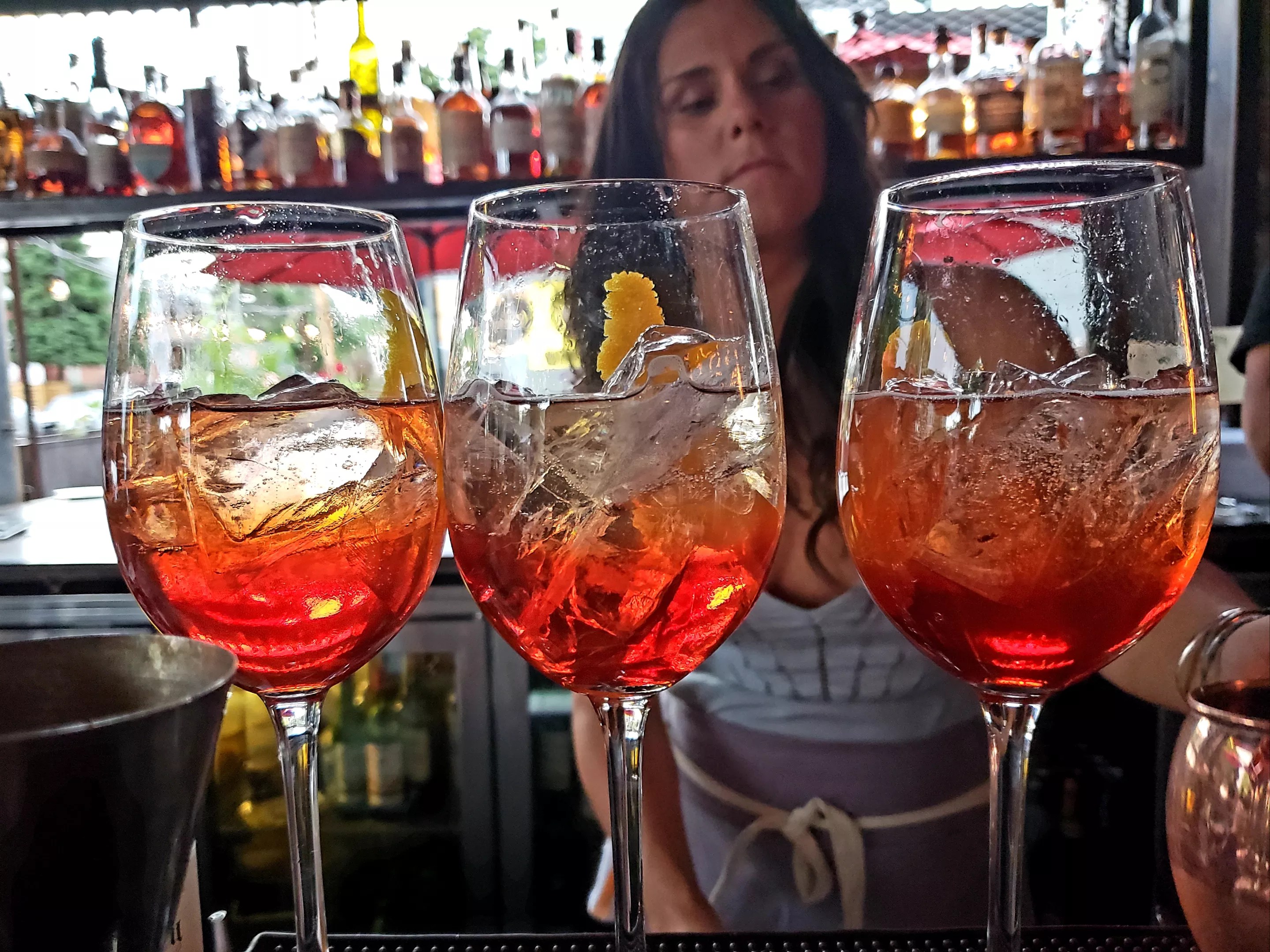 Bartender Suzanne Navarro making a trio of Negroni Sbagliato cocktails, which will be on the Pony Up menu.