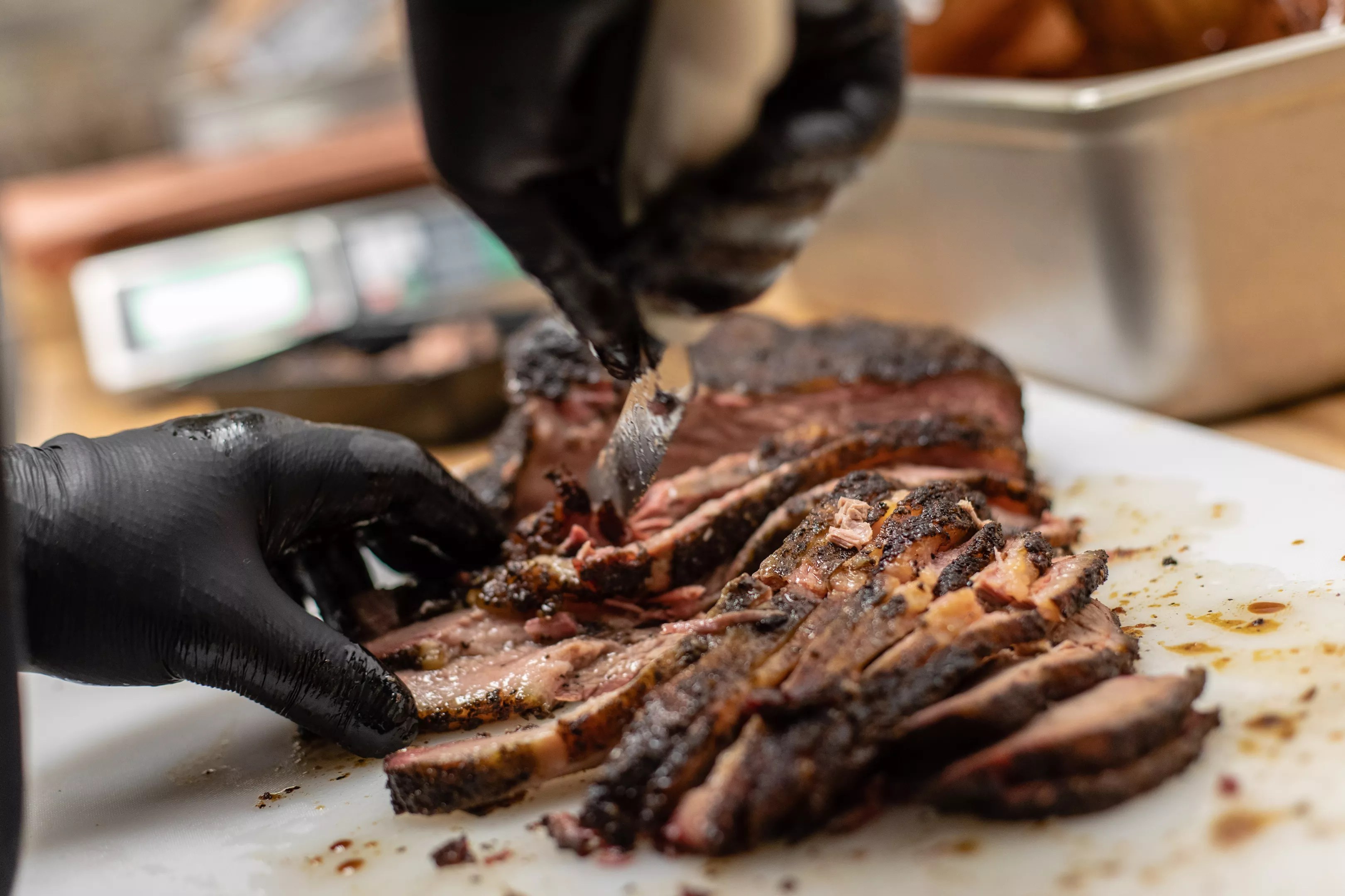 Fort Worth native Nick Prince has been mastering his smoking skills in backyard cookouts and barbecue contests since moving to Colorado twenty years ago, relying on post oak to nail the flavor he remembered from his home state. And now he’s gone pro, opening Post Oak this week at 4000 Tennyson Street, where the namesake wood is the only kind he uses. Prince took over the former Block & Larder space, dropping in a four-ton smoker behind the restaurant and converting the upscale eatery into a counter-service smokehouse with a full bar. Smoked brisket is the specialty of the house at Post Oak. Courtesy Post Oak Barbecue