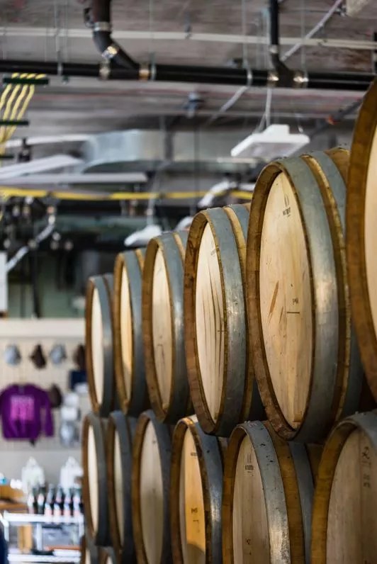 The spontaneous beer is aged in puncheons, which are oversized wine barrels, usually around 132 gallons.