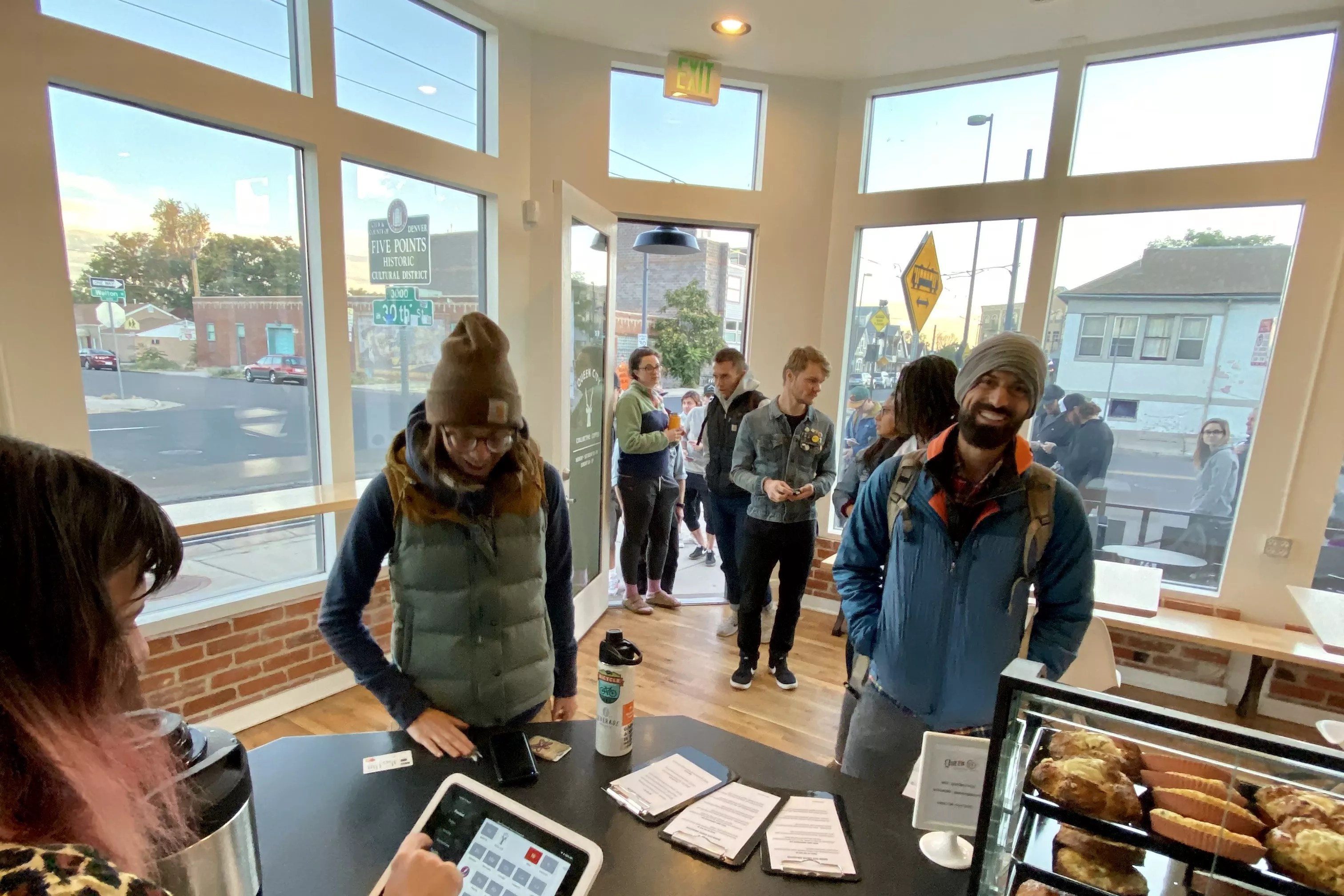 Part of the project involved knocking down a wall to open up the already bright, window-lined interior, and the brothers also refinished the wood floors and painted the space, adding their logo to one wall and graffiti by Denver artist Christian Millet in the bathroom. They removed the actual purple door that was once the front entrance and gave it to Smesrud, replacing it with a glass door with the Queen City logo. That door opened to the neighborhood on September 27.