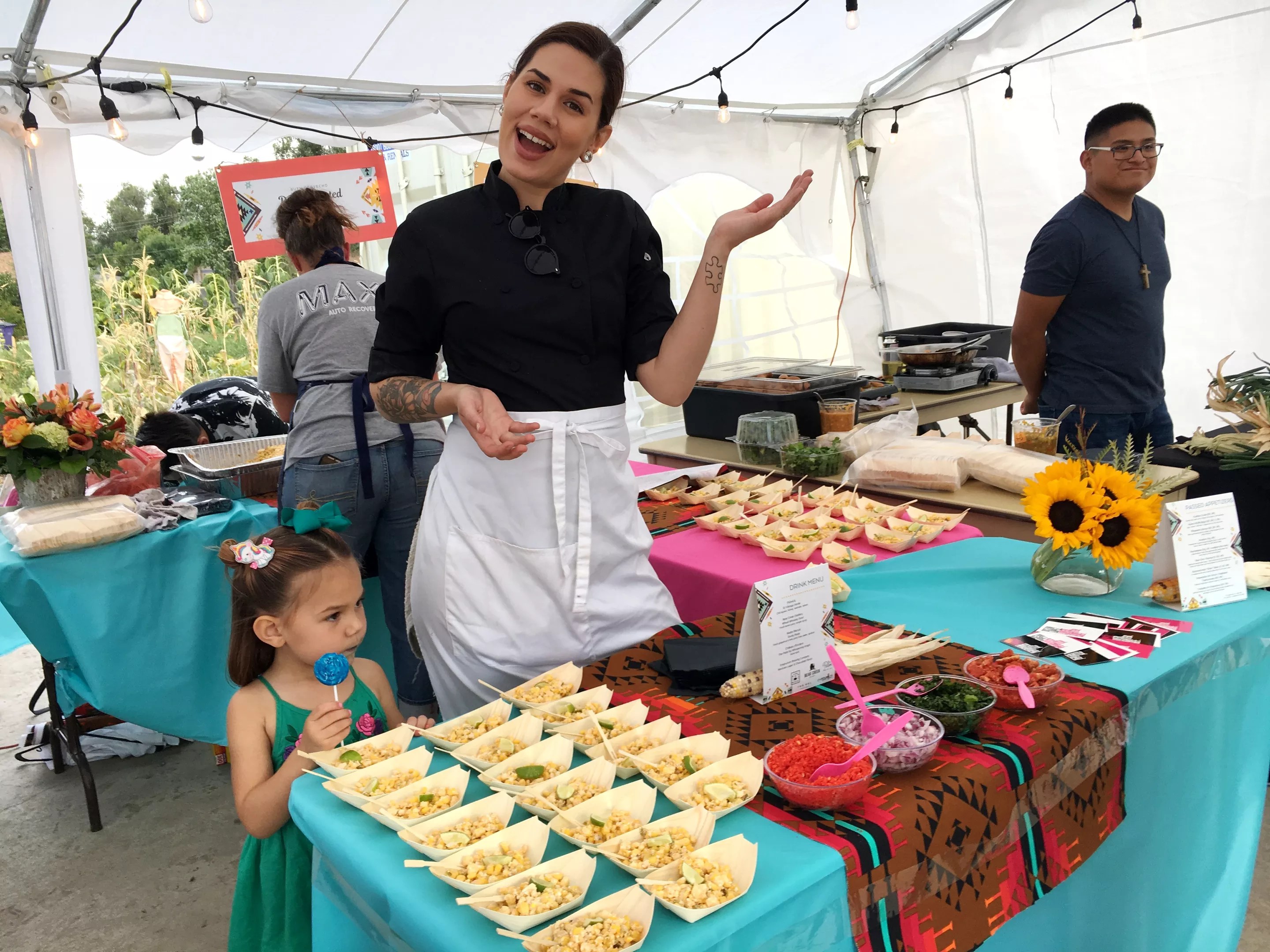 Chef Ocean Lopez serves elote at Re:Vision’s Buen Provecho cocktail hour and dinner.