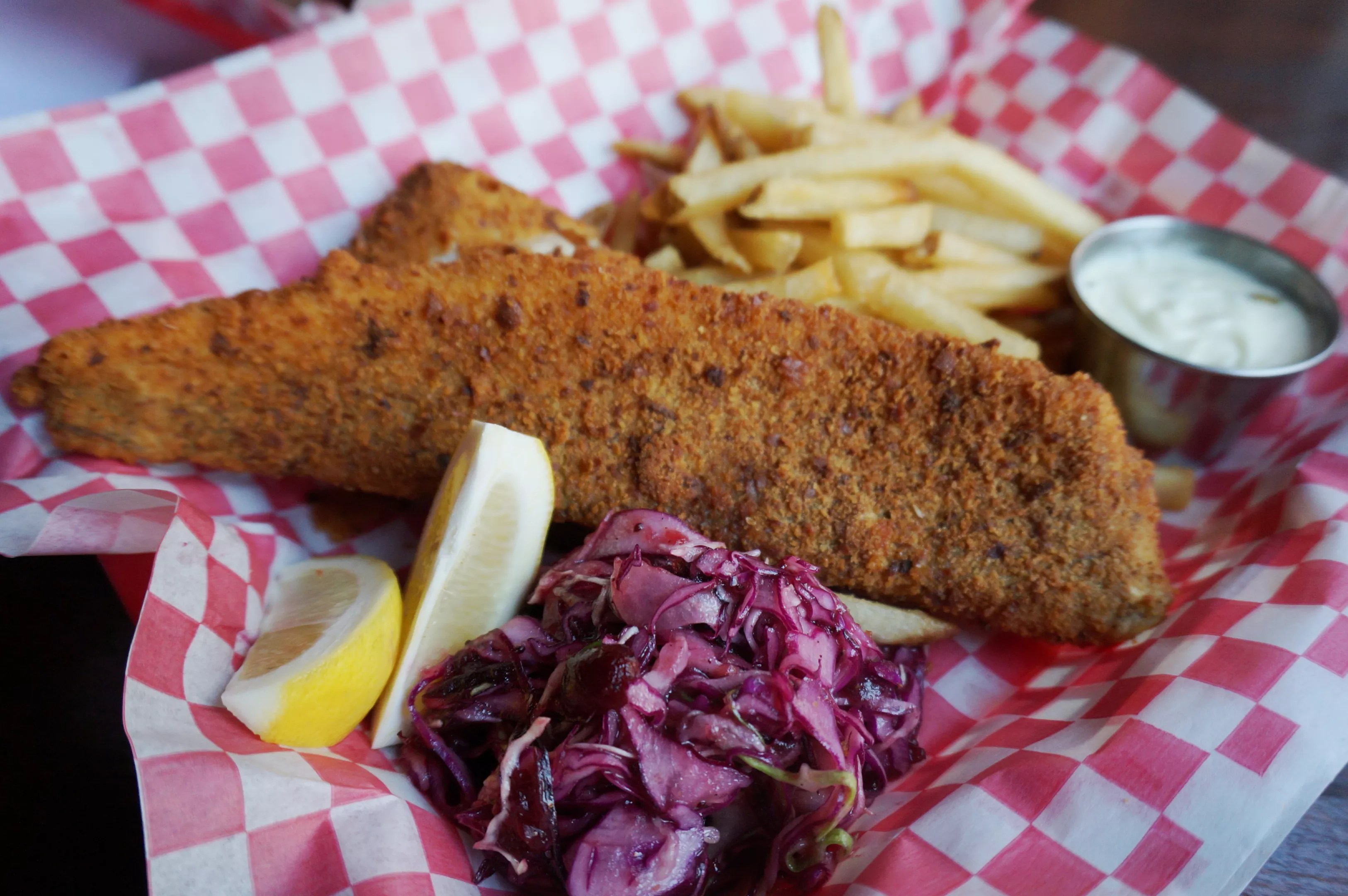 Fried walleye with Oshkosh cranberry slaw.