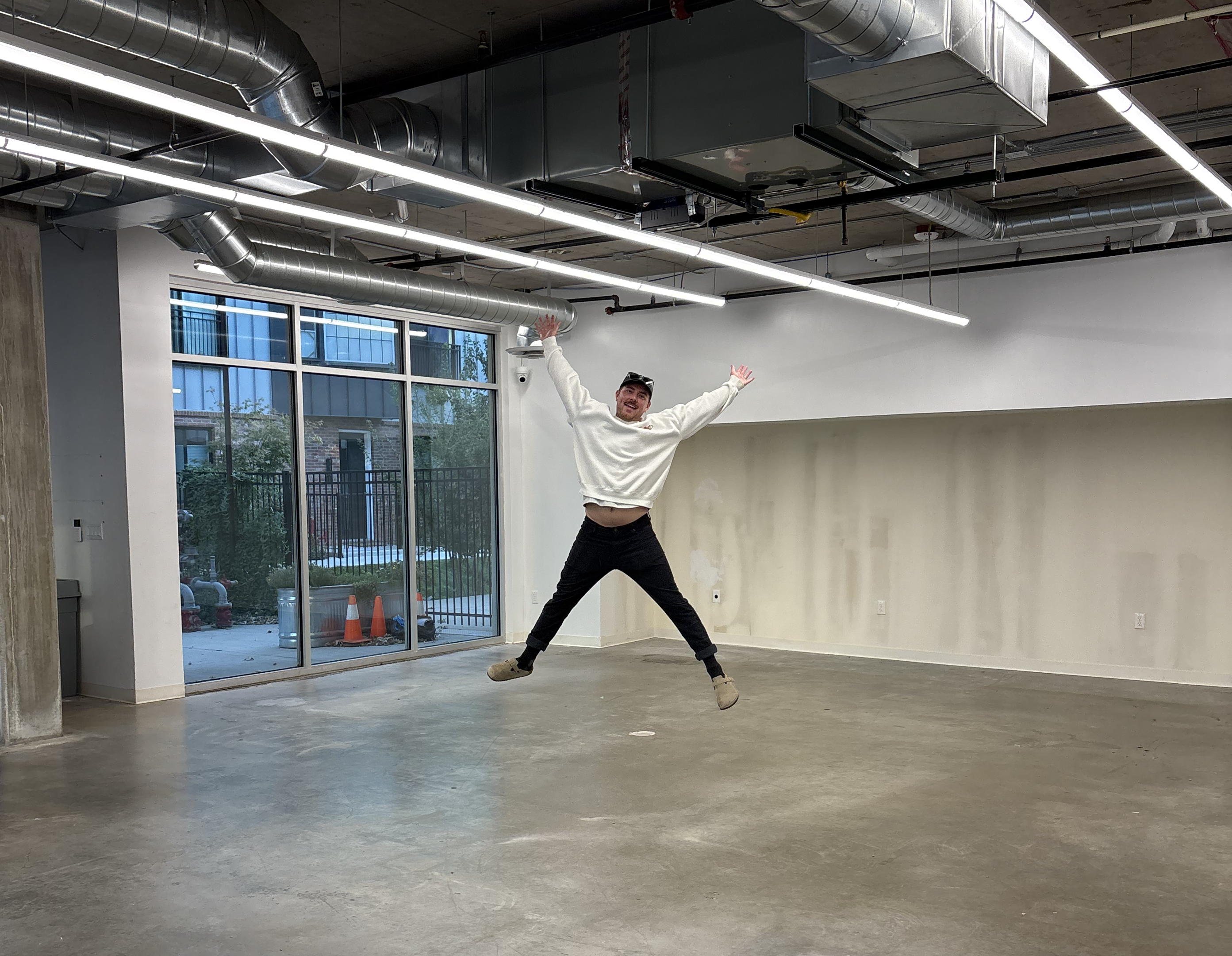 Aaron Cummins celebrating in the studio’s upcoming home.