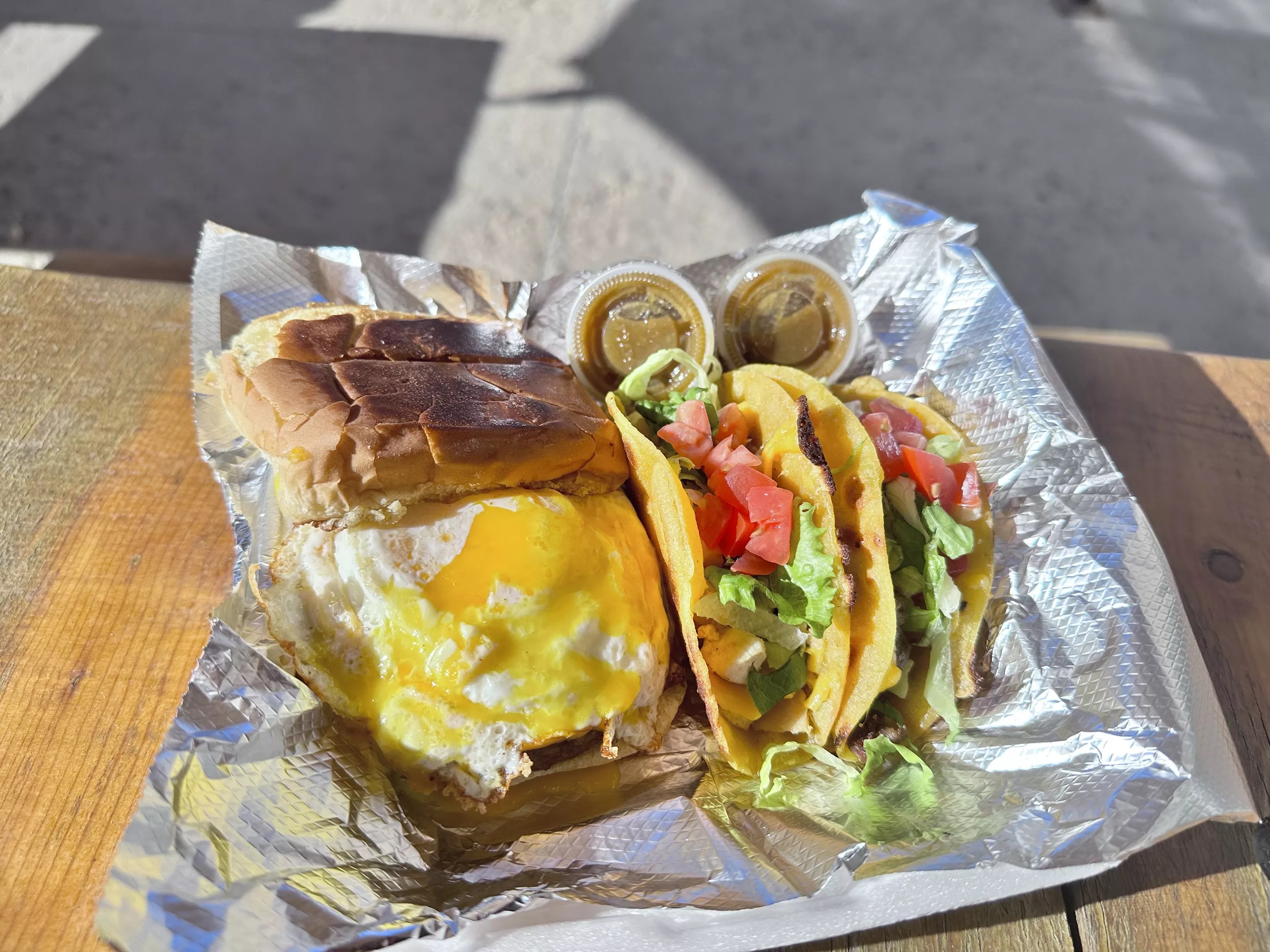 Roll’n Up Chingon’s breakfast sandwich and grilled tacos.