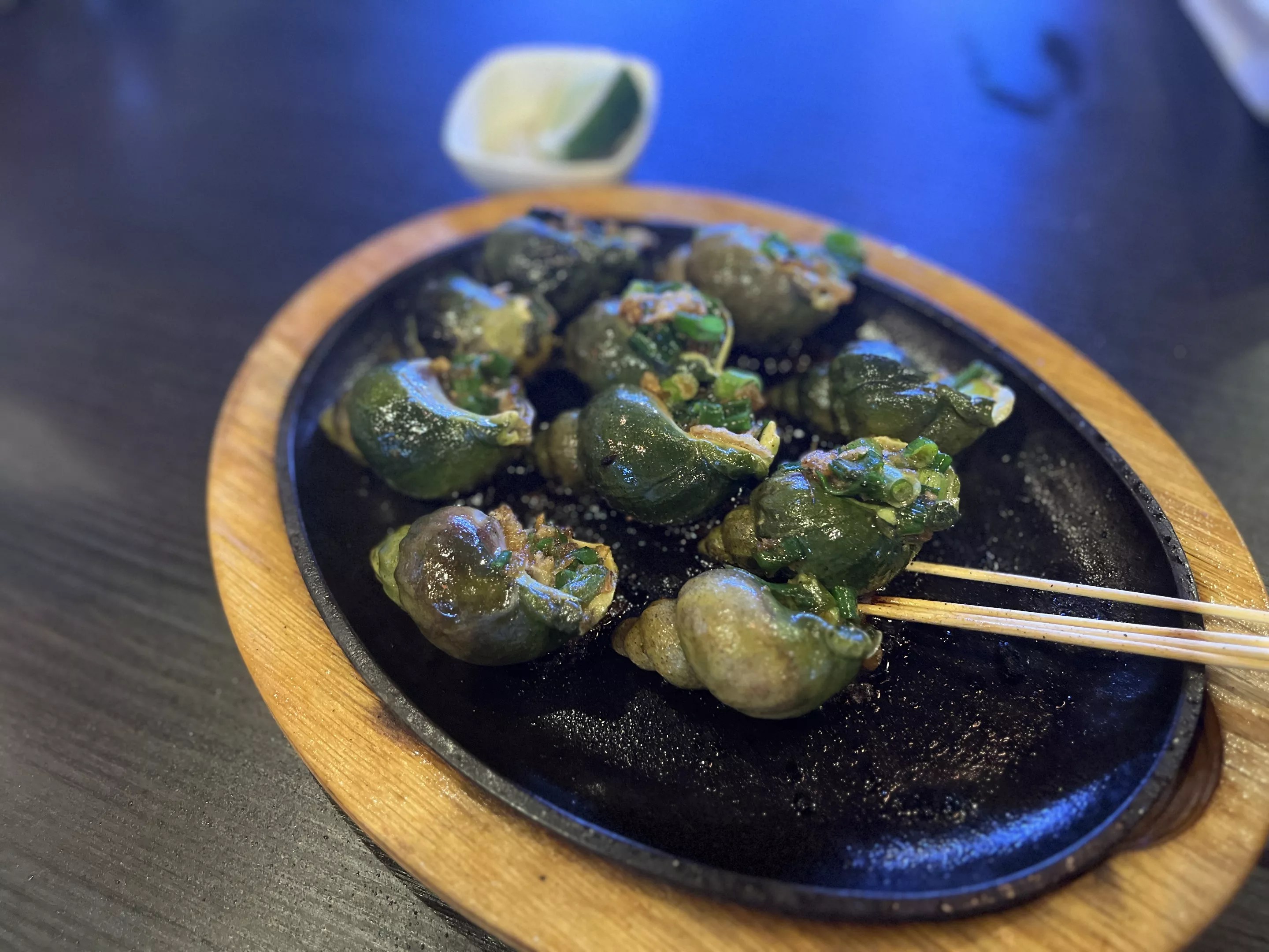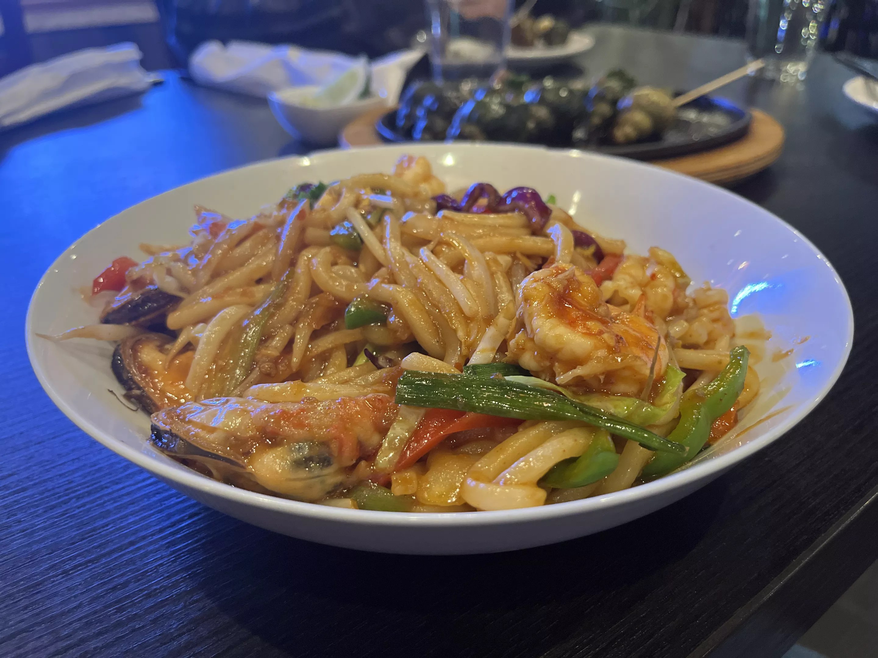 The escargot with garlic butter sauce ($17) is served on a hot plate that keeps the steam rising off the snails for at least five minutes after it’s set down on the table. Vietnamese hot pot comes the traditional way, in a family-sized metal pot with a fire beneath to keep the food warm as you eat, while stir-fried spicy seafood udon ($16) includes tender mussels, shrimp, squid and vegetables doused in a savory sauce.
