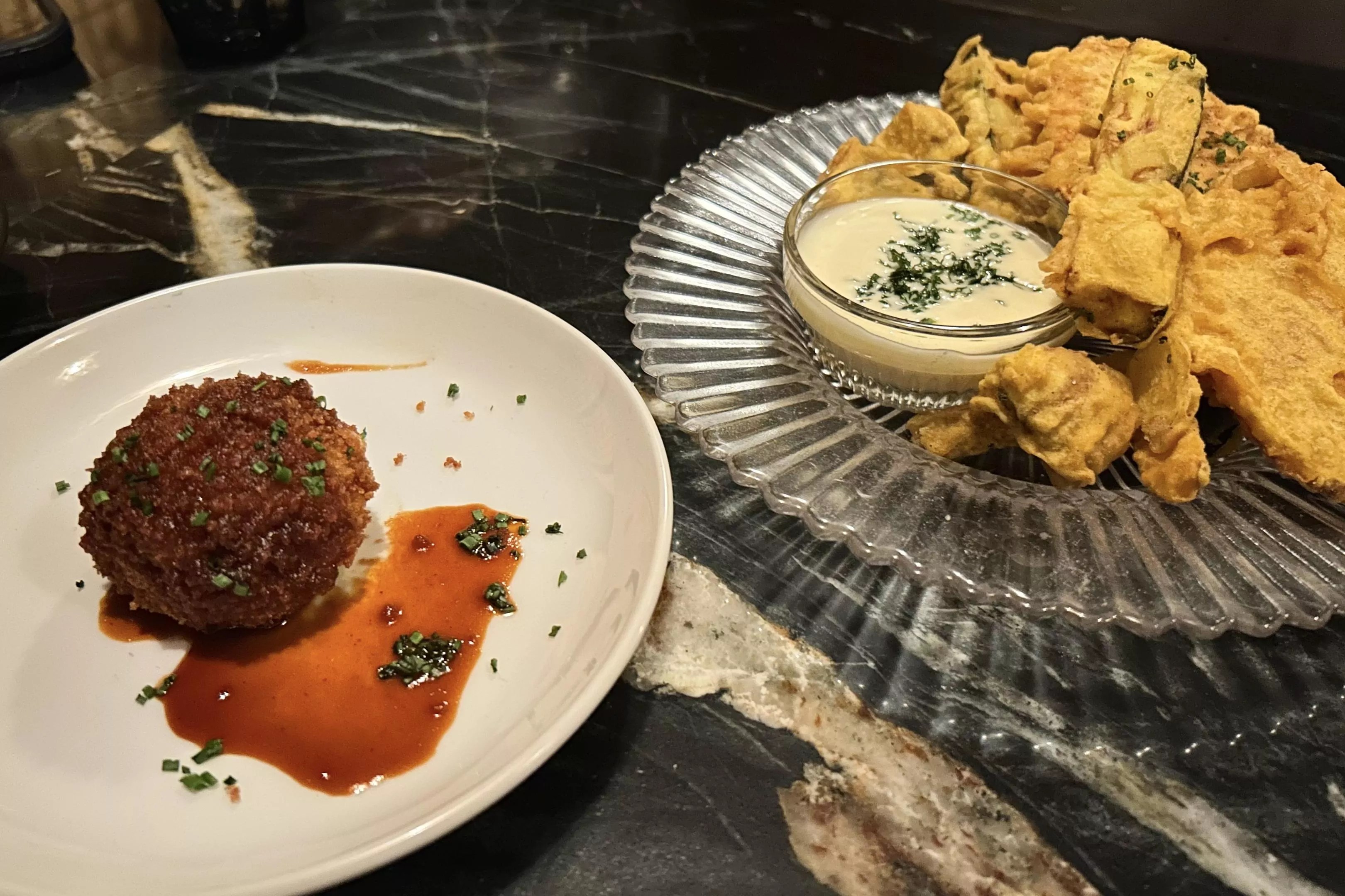 Potato croquette and vegan vegetable tempura appear on the food menu.