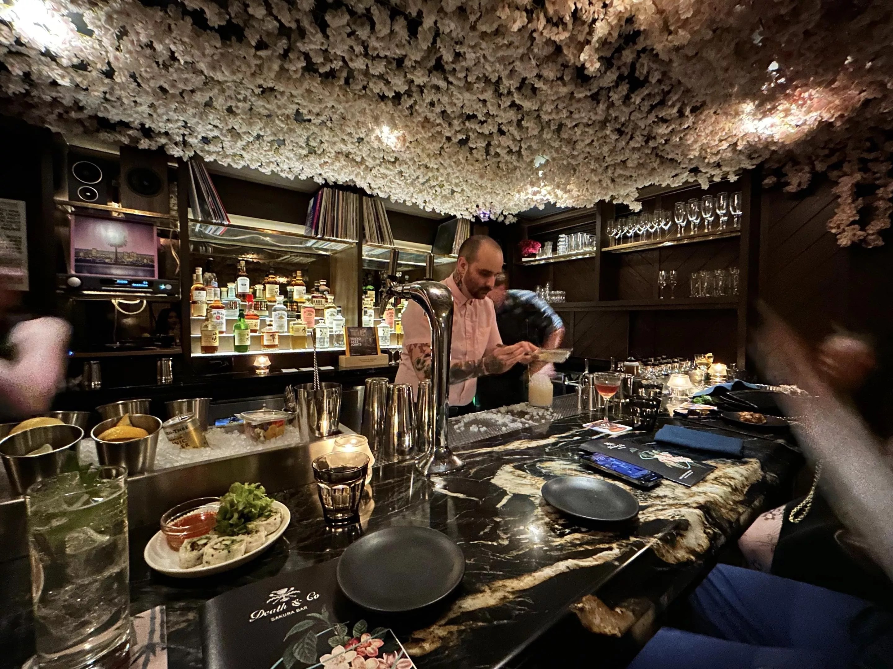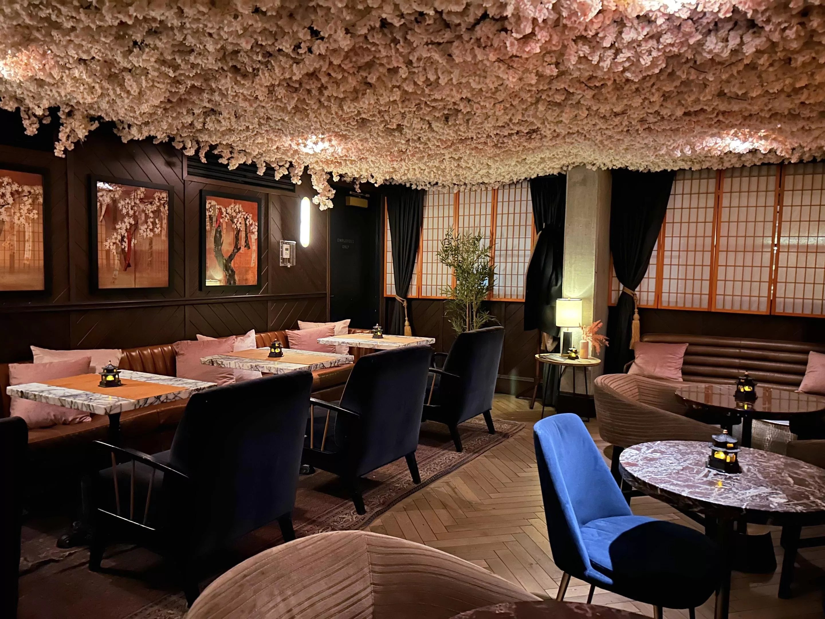 Hundreds of faux cherry blossoms hang from the ceiling of Sakura Blossom Bar.