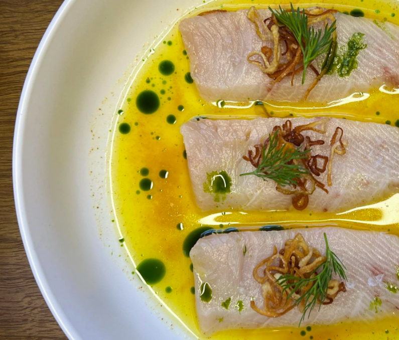 Chả cá lã vá»ng is hamachi, turmeric leche de tigre, dill and mắm tôm.