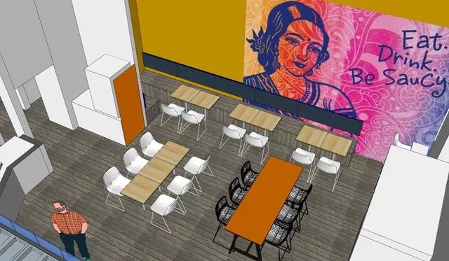 Rohini Miranda is a professional architect, so some of the design is hers, though she turned over the majority of the work to another architect once the concept had been created. The order counter and tandoor oven will be on the left for customers entering off Colfax, and a thirty-seat dining room will be on the right, along with a floor-to-ceiling mural to add a splash of color. Above the cash register, a second mural will display the restaurant’s motto: “Eat. Drink. Be saucy.”