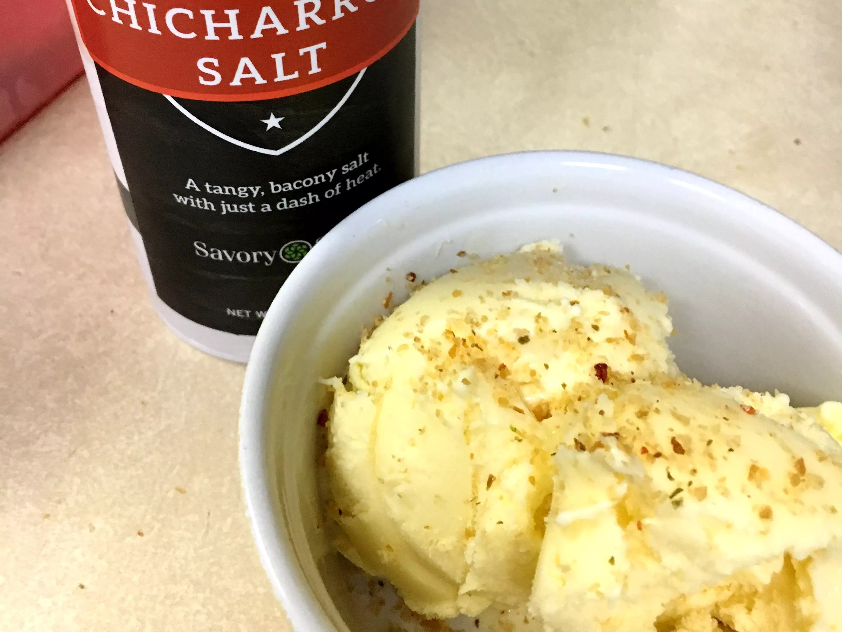 Homemade goat-cheese ice cream (donated by a friend) topped with chicharron salt.