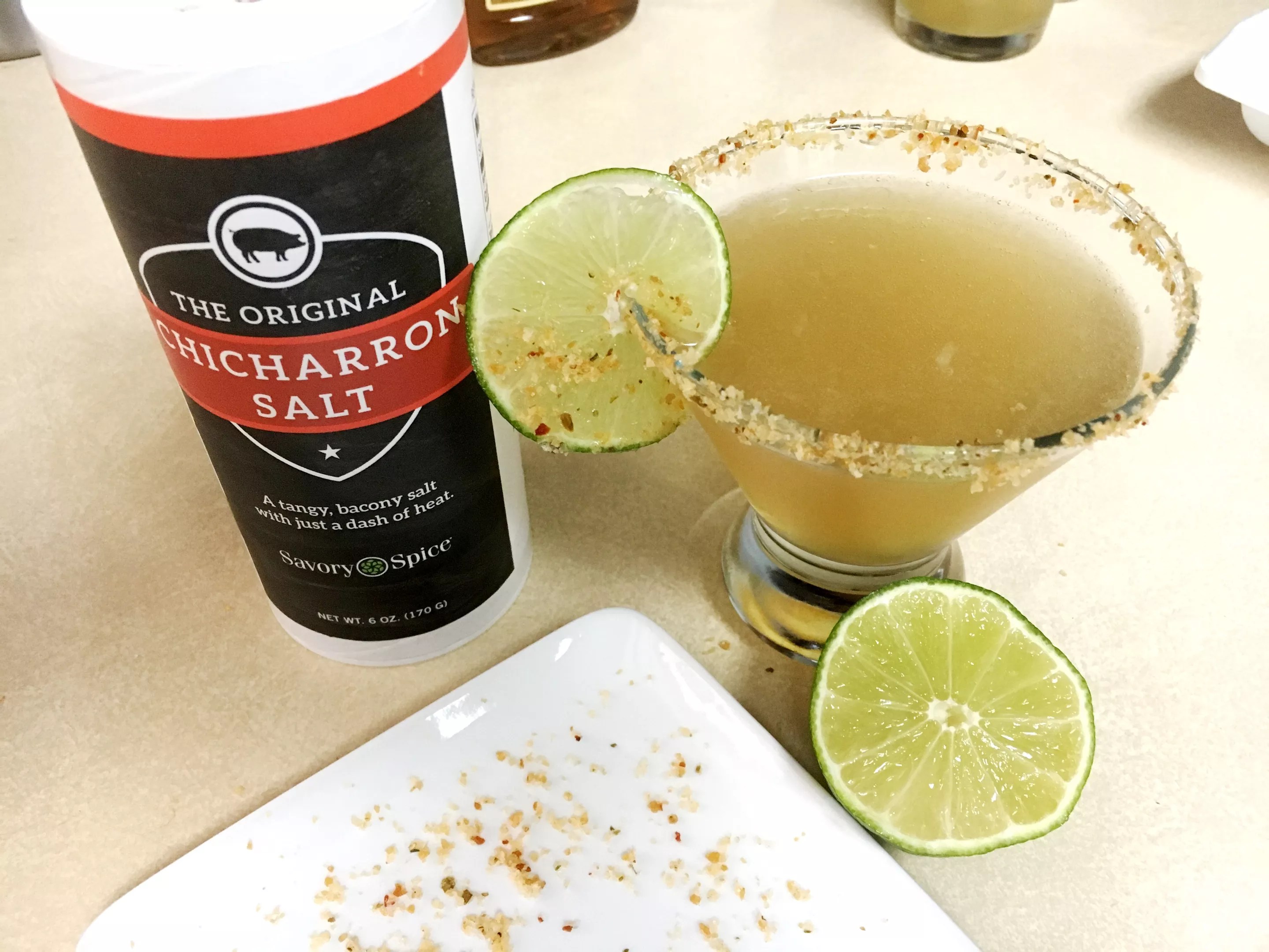 Reposado margarita with chicharron salt rim. Coat only the outer rim of the glass so that the salt doesn’t fall into the margarita.