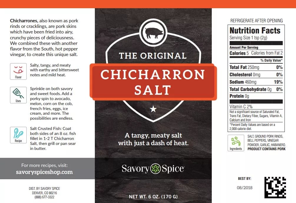 From there, he produced a small batch and sent a sample to Colorado State University for shelf-life testing. After the test results came back indicating that the product would be shelf-stable for a year, he knew he could go ahead with production – and so Savory Chicharron Salt was born. The recipe is fairly simple: just salt, pork rinds, vinegar powder and dried bell pepper, habanero and garlic. But the result is complex and powerful, with heat and tang backing up the full pork flavor.
