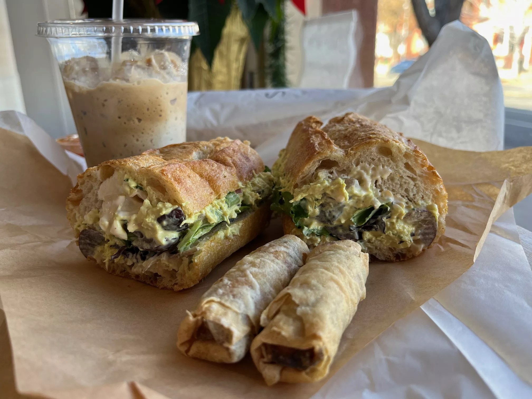 Vegetable egg rolls, Vietnamese iced coffee and a curried chicken salad sandwich from Sesame.