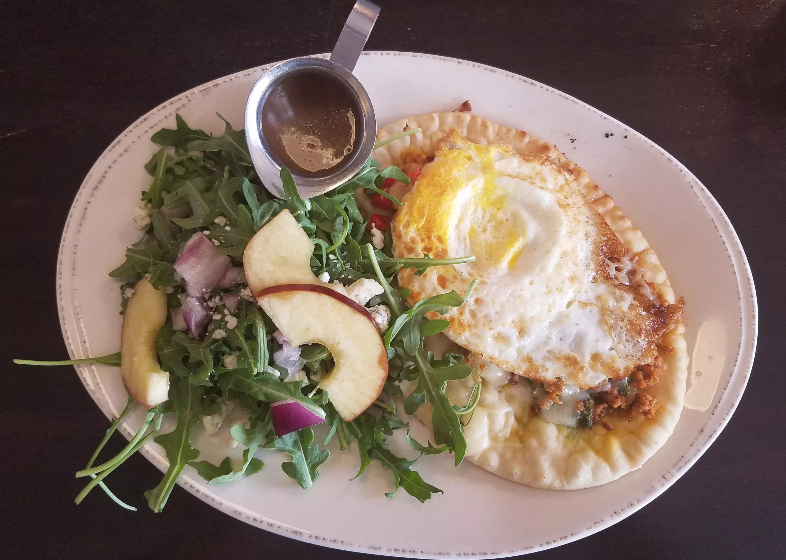 Personal brunch pizza on naan bread from Syrup.