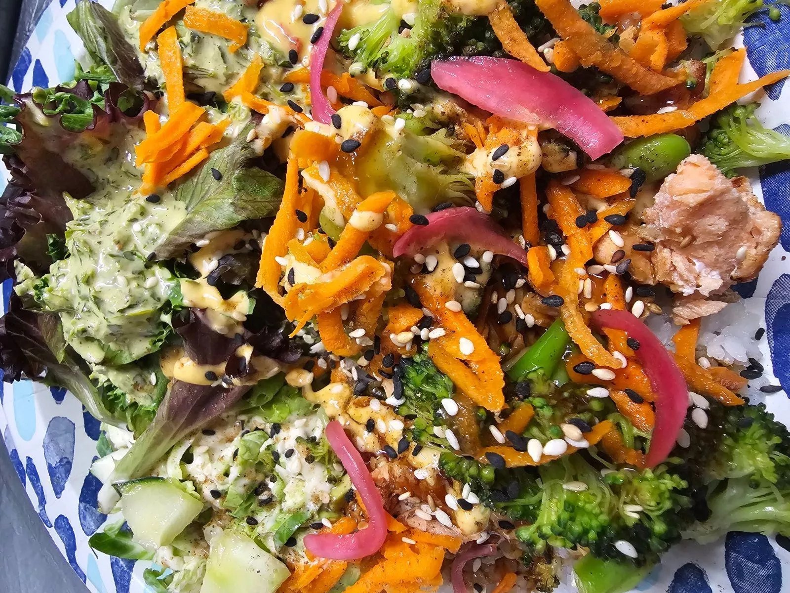 “I do American fusion. It’s kind of an eclectic and fluid menu,” Weinstein says. One of his most popular dishes is the Samurai Rice Bowl. “It starts with jasmine rice and then we’ve got teriyaki salmon seasoned with a five-spice rub, topped with mixed greens, Asian slaw dressing, Thai aioli, pickled and steamed vegetables,” he explains.