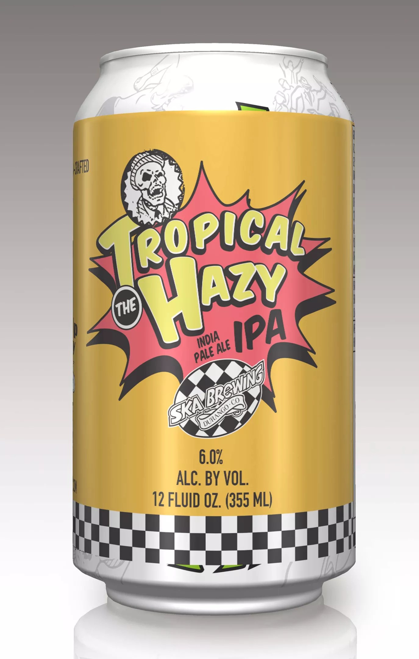 In other words, beer drinkers who buy The Tropical Hazy IPA, Ska’s brand-new beer, might see the label wrapped around a can that was previously printed up to package beers like Moral Panic Brut IPA or Rudie Session IPA. (Ska already owned a labeling machine for small-batch beers.) So there could be hints of other colors and graphics peeking out from above or below the Ska labels.