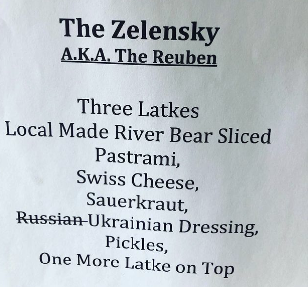 Latke Love at 699 West Littleton Boulevard in Littleton has renamed its badass Reuben after Ukraine President Volodymyr Zelensky. “Back this week, with a new name and still awesome,” it says. Another update: The Russian dressing is now dubbed Ukrainian dressing.