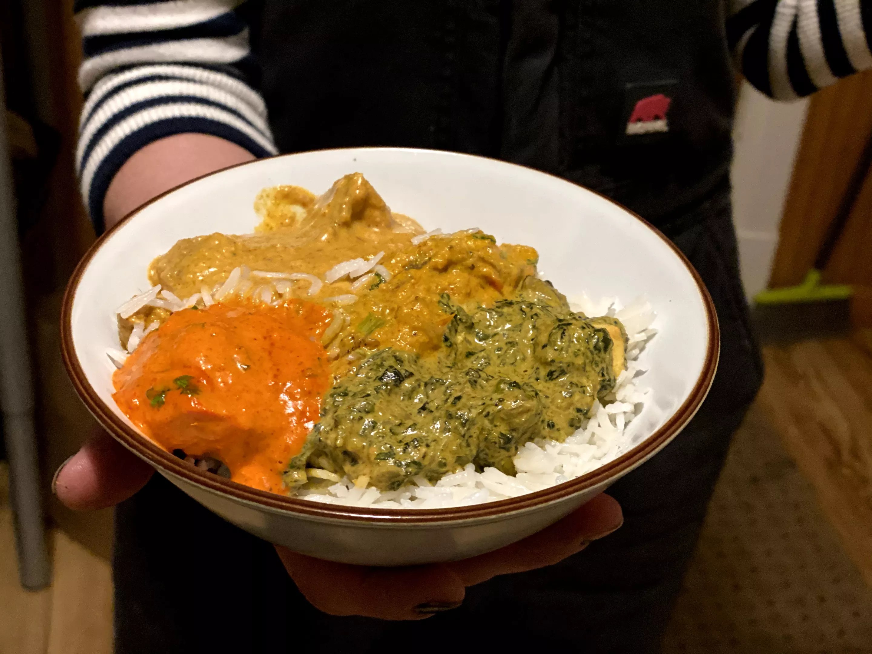 For our Spice Room home Indian feast, my roommates and I opted for four curry dishes we knew would carry us through the week (and, it turns out, beyond). First, the old standby: saag. I have to quote the website here, which matches my sentiments exactly, “It’s hard not to love the rich, thick, creamy spinach.” Add cubes of fresh Indian cheese to the mix – making it saag paneer – and you have yourself a perfect feel-good comfort food. In addition to saag paneer ($13), Spice Room offers a gamut of proteins and veggies that can be included in the saag base, including potato, chickpeas, daal (usually split lentils), tofu and mushroom (all for $13), and chicken ($15), lamb ($17), shrimp ($18) or salmon ($19). So you could order this dish once a week for almost three months and never have a repeat.