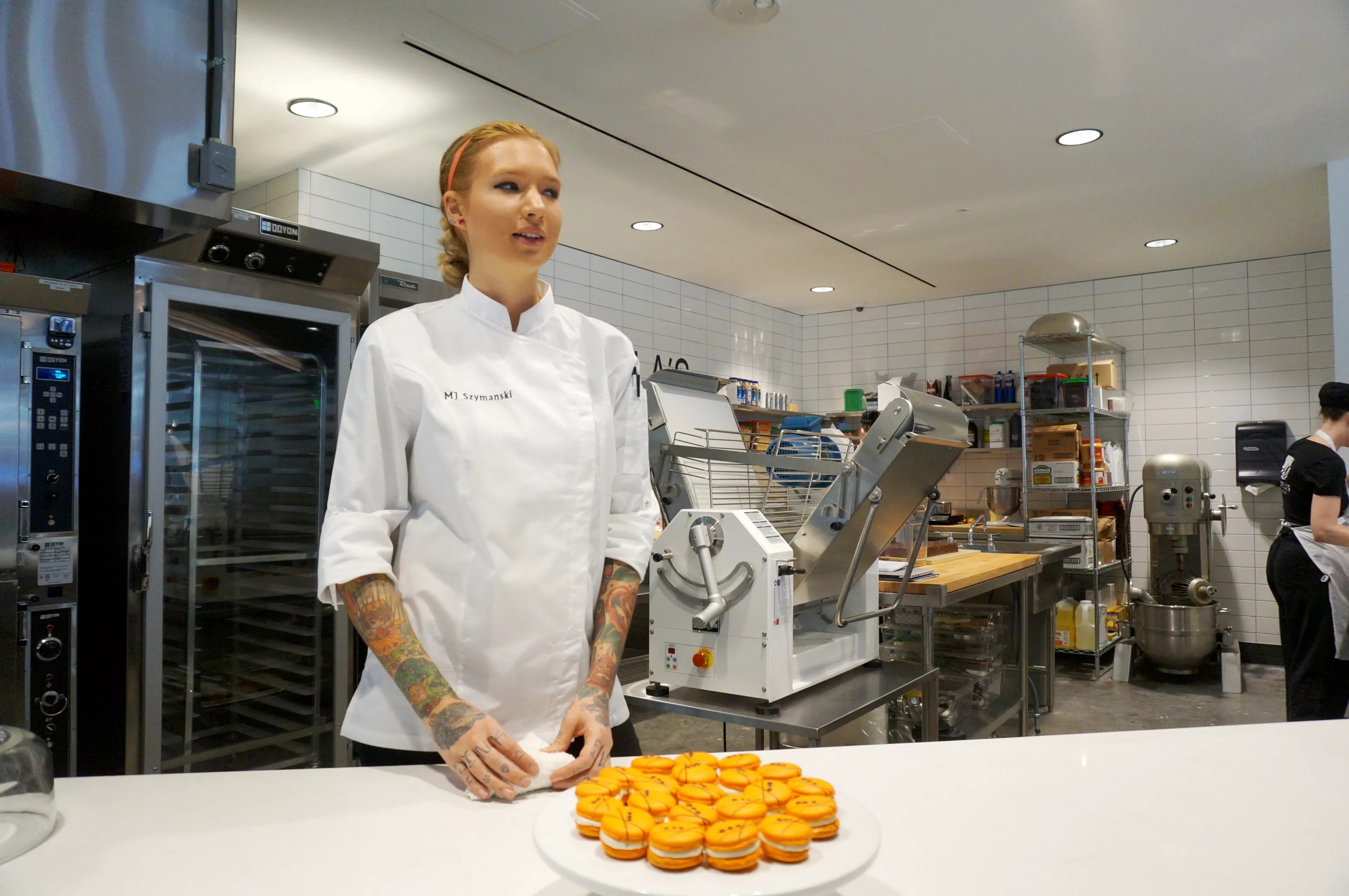 Pastry chef MJ Szymanski with a tray of her passion-fruit macarons.