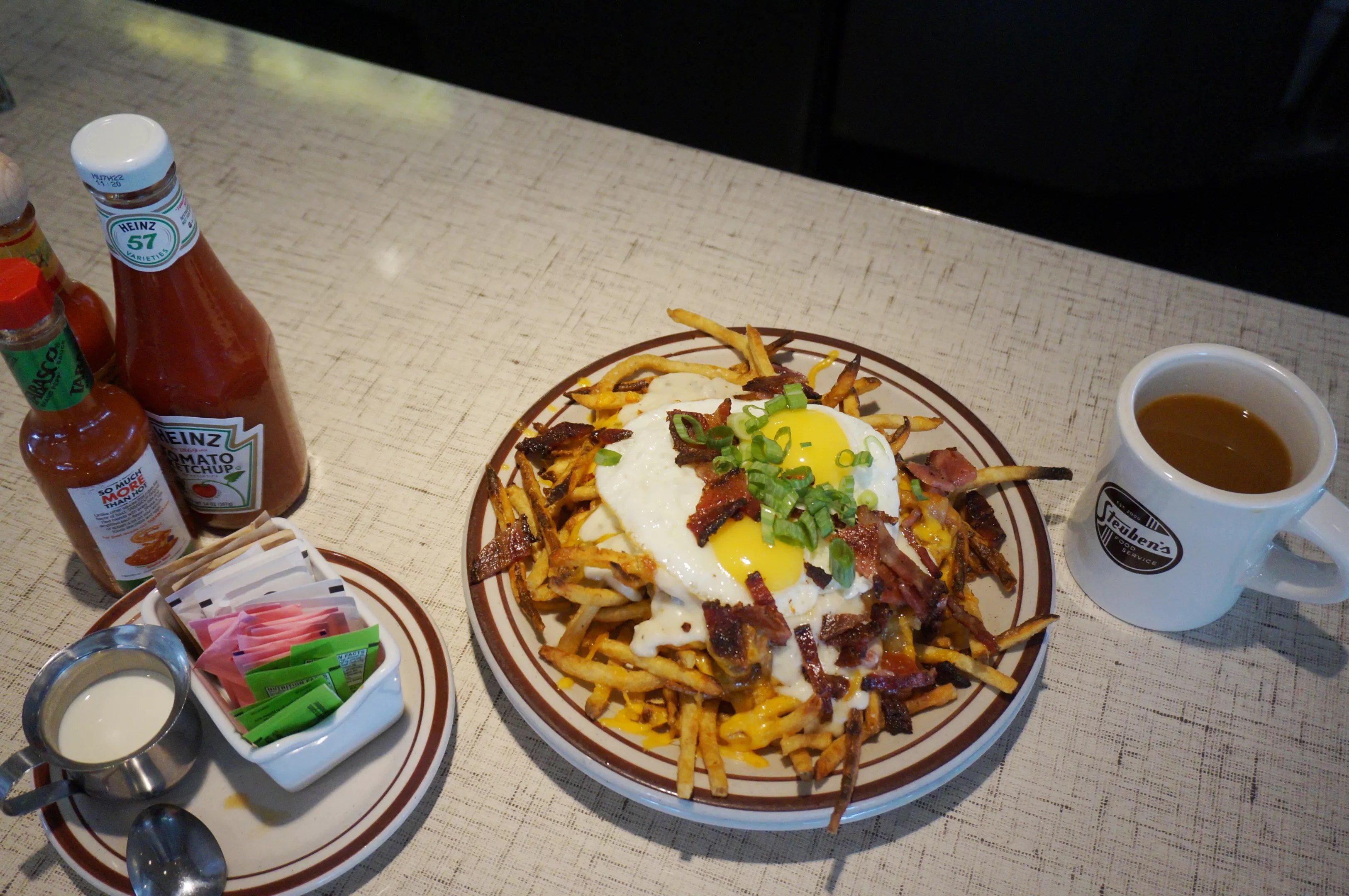 The Traffic Jam is classic Steuben’s: a big plate of smothered fries with bacon and eggs.