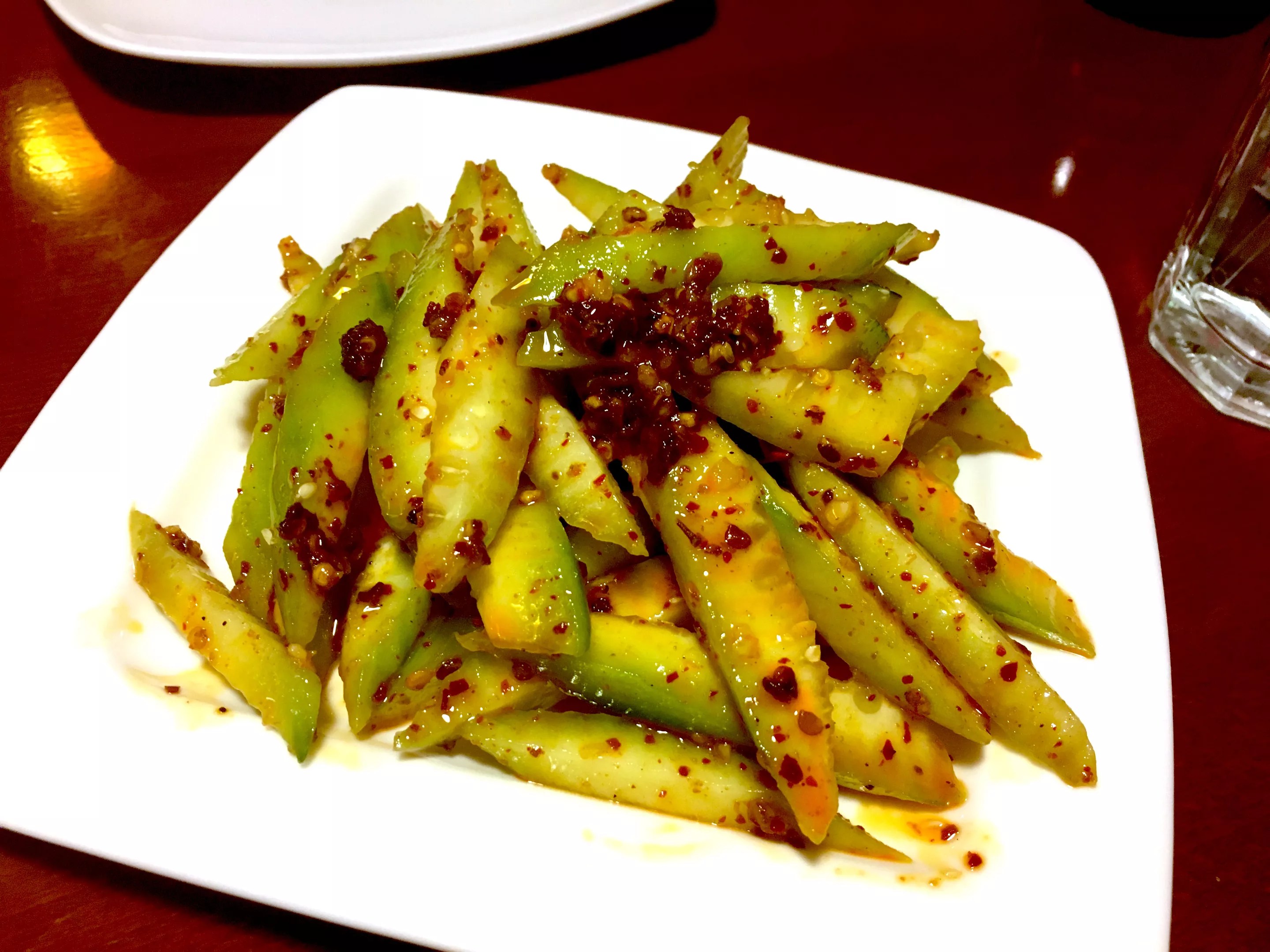 Consider starting your meal with the tea-smoked eel, a Sichuan specialty that comprises fish marinated in and then smoked with tea and sugar. You’re presented with cold slices that balance smoke and sweetness, with just a tinge of earth from that tea. Tea-smoked duck is more iconic, and if you’d like an entree-sized portion done in this technique, you could consider that, too. Our server told us to make sure we get the poultry next time, and given the quality of the rest of her advice, I think I’ll listen. Sunflower’s spicy cucumbers. Laura Shunk