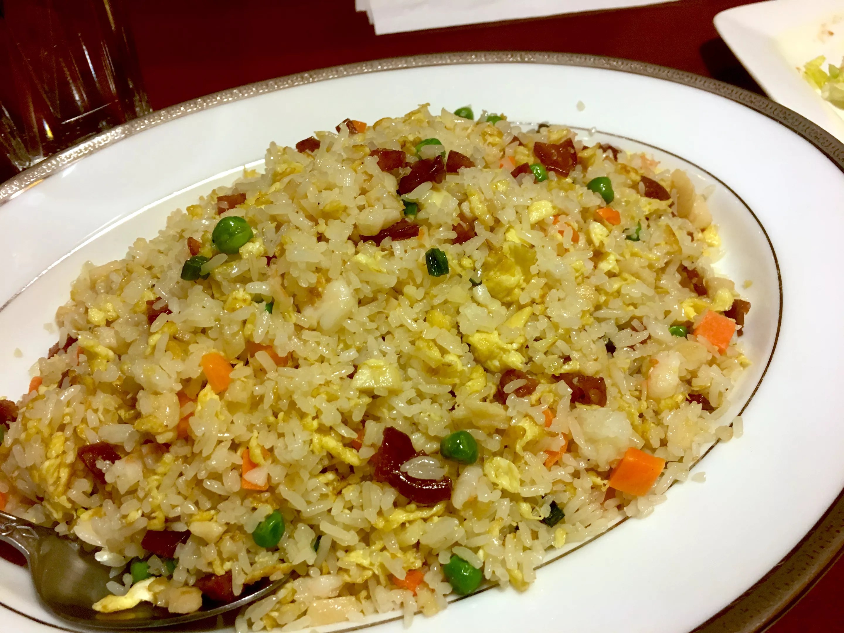 That staff really dials up the charm if you ask for the traditional Chinese menu, which is the same length as the American-Chinese menu that you’ll likely be handed first. Lee told me the owners of Sunflower are from Jiangsu province, which is home to one of the eight great regional cuisines in China. (Other great regional cuisines include Sichuan and Cantonese, which most of us are considerably more familiar with.) Jiangsu cooking focuses on freshness and plenty of seafood; many dishes skew toward the sweet side. You’ll also see several specialties surrounding duck; there’s some evidence that Nanjing, the largest city in Jiangsu, is the originator of the roast duck and pancakes now associated with Beijing and commonly known as Peking duck. And dishes are fairly fancy in their presentations; one of the most memorable dishes I ate in the region was called squirrel fish, named for the way a whole fish is complicatedly cut and arrayed so that it resembles a squirrel’s tail. Yangzhou fried rice with seafood and Chinese sausage. Laura Shunk