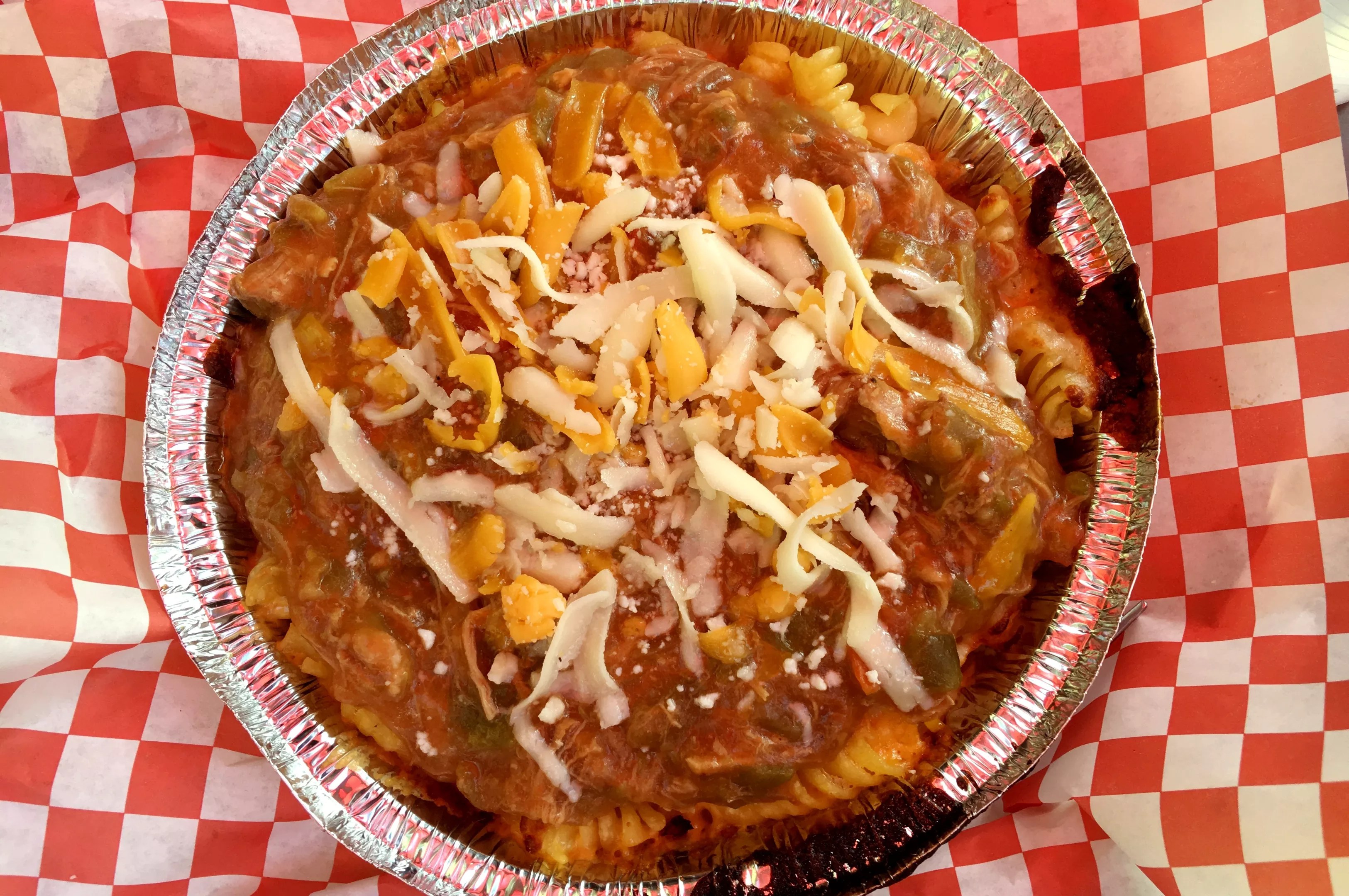 A chalkboard menu greets visitors with a list of more than 25 meaty and a half-dozen or so vegetarian macs, nearly all of which are named for U.S. cities and states, hence the name Mac Nation. Each order is built with rotini (a fine substitute for elbow mac, since the many coils hold more cheesy sauce) in an aluminum pan and topped with regional ingredients from around the country. A quick finish under the broiler adds crispy bits to the edges of each round pan. The Colorado: mac and cheese topped with pork green chile. Mark Antonation