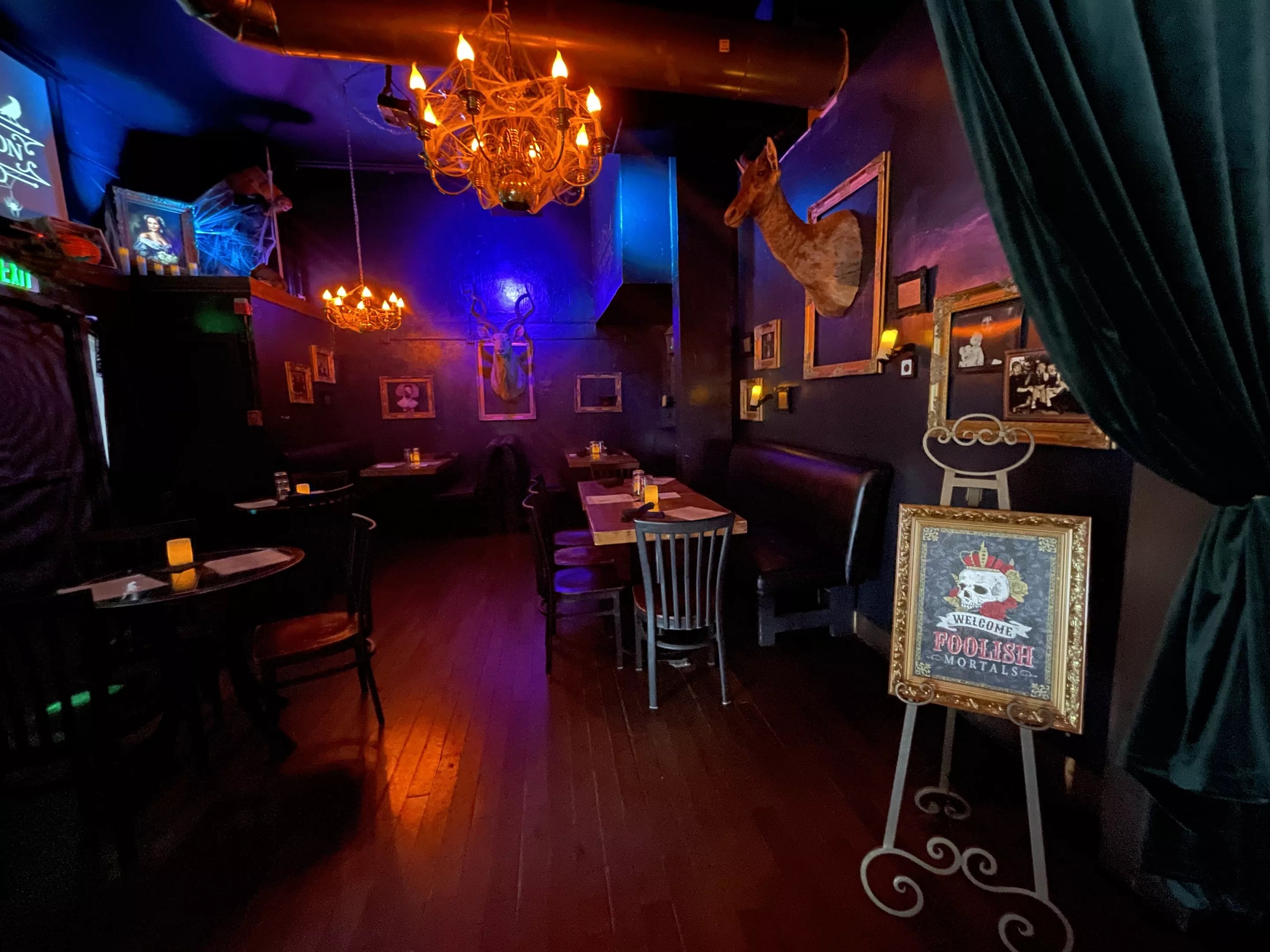 In addition to the spooky decor, the pop-up is offering six specialty cocktails, each with a haunted twist. The Blood Witch, for example, includes a housemade raspberry and Fresno pepper syrup that turns the martini into a bloody treat. Save the Last Snake comes in a cauldron, and the Beetle’s Juice arrives with a smoke bubble floating atop the whiskey and red wine drink.