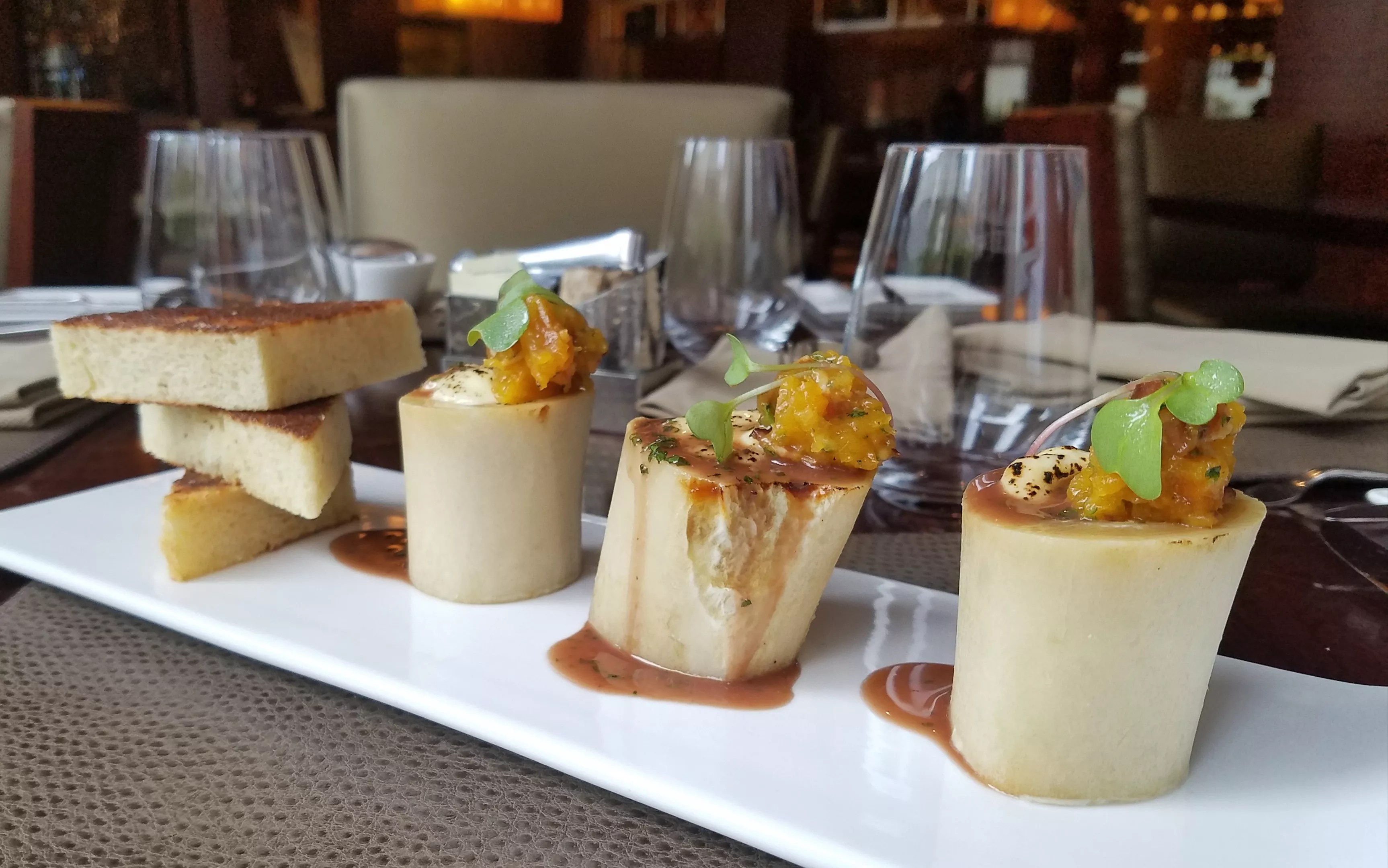 Sure, you can order the intense wagyu tomahawk steak or a tantalizing wagyu burger at this downtown hotel restaurant, but if you really want to see the skills of chef Zack Rozanski, order the wagyu bone-marrow custard as a starter. To make this delicate and rich dish, the chef utilizes beef and marrow from 7X Ranch, liquefies it, and then sends it to the pastry team to turn the meat fat into an indulgent pastry cream, minus the sugar. Instead of sweet, it gets a savory blast of fresh thyme and salt. Then the mixture is put back into little bone cups and topped with a dried-apricot compote. Smear this $18 appetizer on a triangle of housemade brioche toast and wallow in each bite.