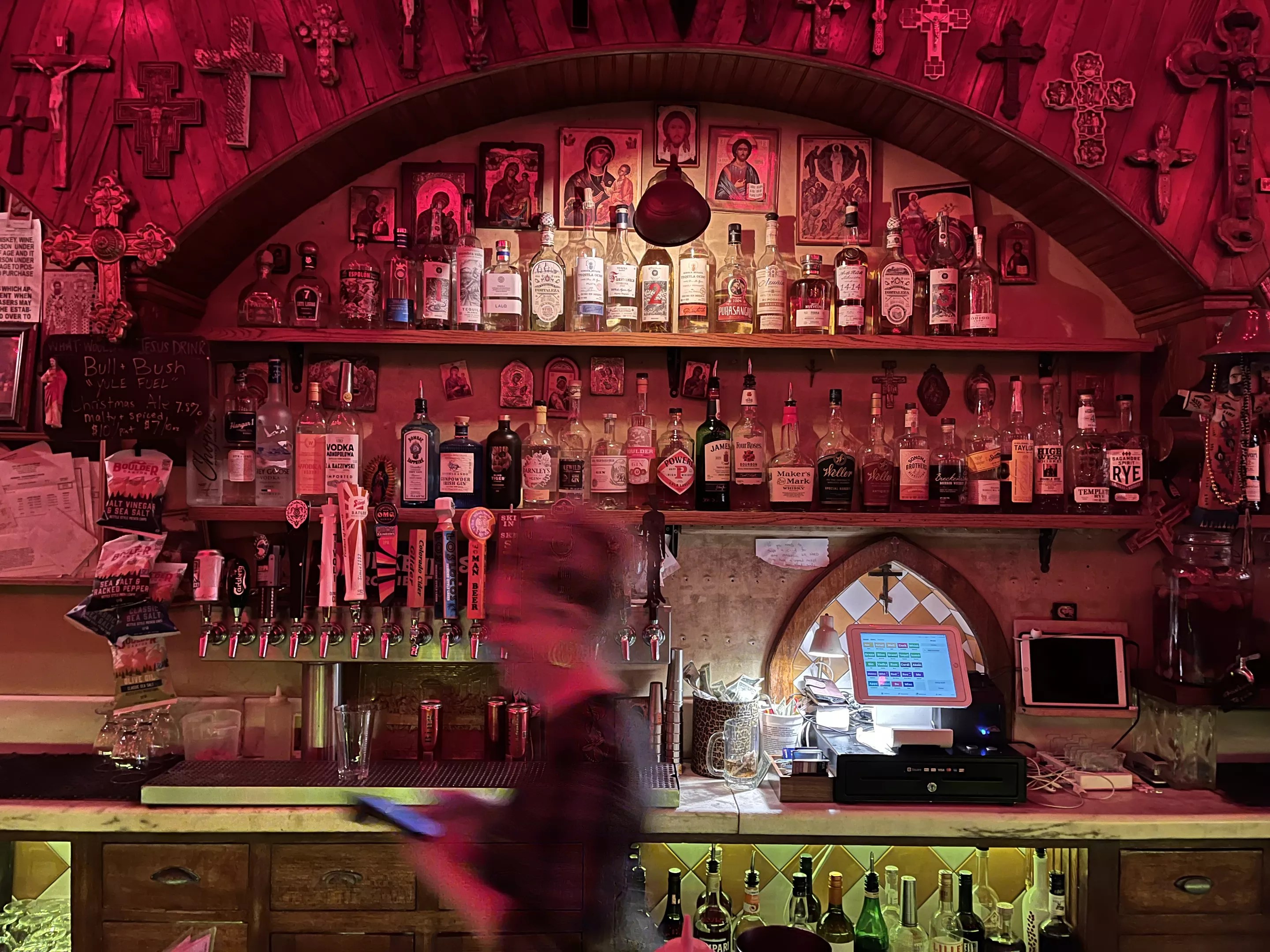 There is a timelessness to the Thin Man. The pillared back bar is capped with hardwood panel arches festooned with crucifixes and lined with bottles of booze, glass jugs of vodka infusions and a hand-painted sign reading “Drunkenness Prohibited” that hangs above the digital tablet station serving as the register. This is the only modern element that gives away the fact that you’re not actually drinking in a 1930s Eastern European mountain chalet decorated by an estranged Vatican interior designer.