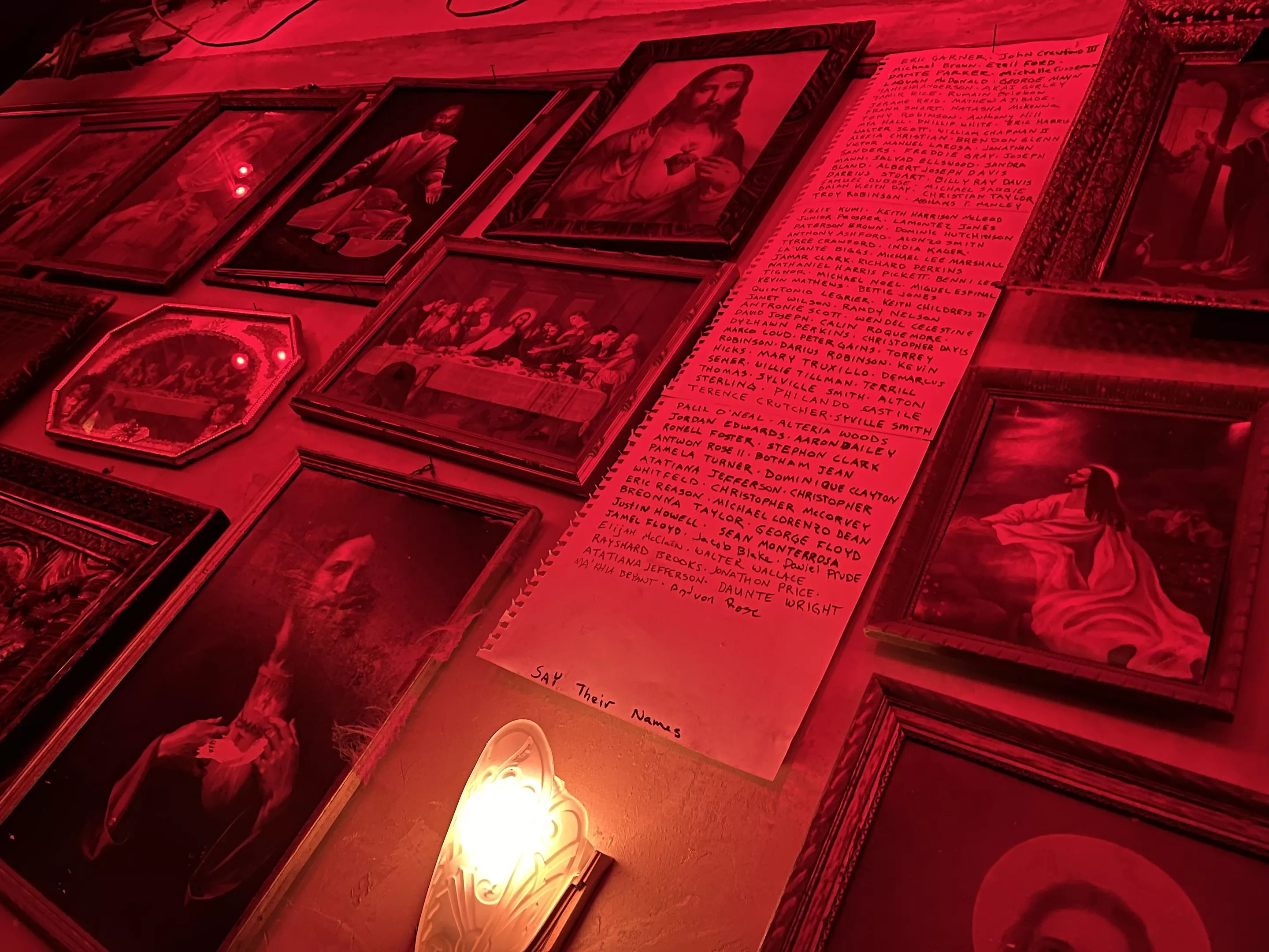 Along the rear wall, between the Christian kitsch and velvet Christ paintings, hangs a long and growing list of handwritten names in black ink on white paper running down the wall. Each person cited was killed by police in this country. The first name on the list is George Floyd. The latest is Tyre Nichols.