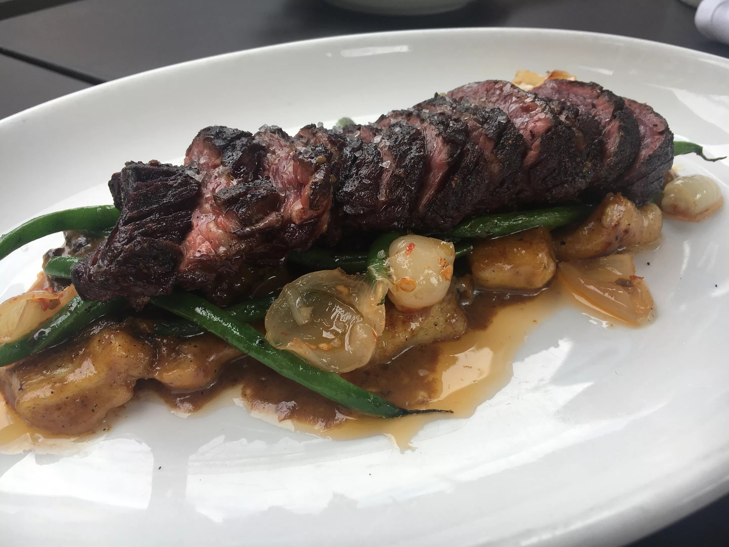 Hangar steak with morel cream sauce, haricots verts and gnocchi.
