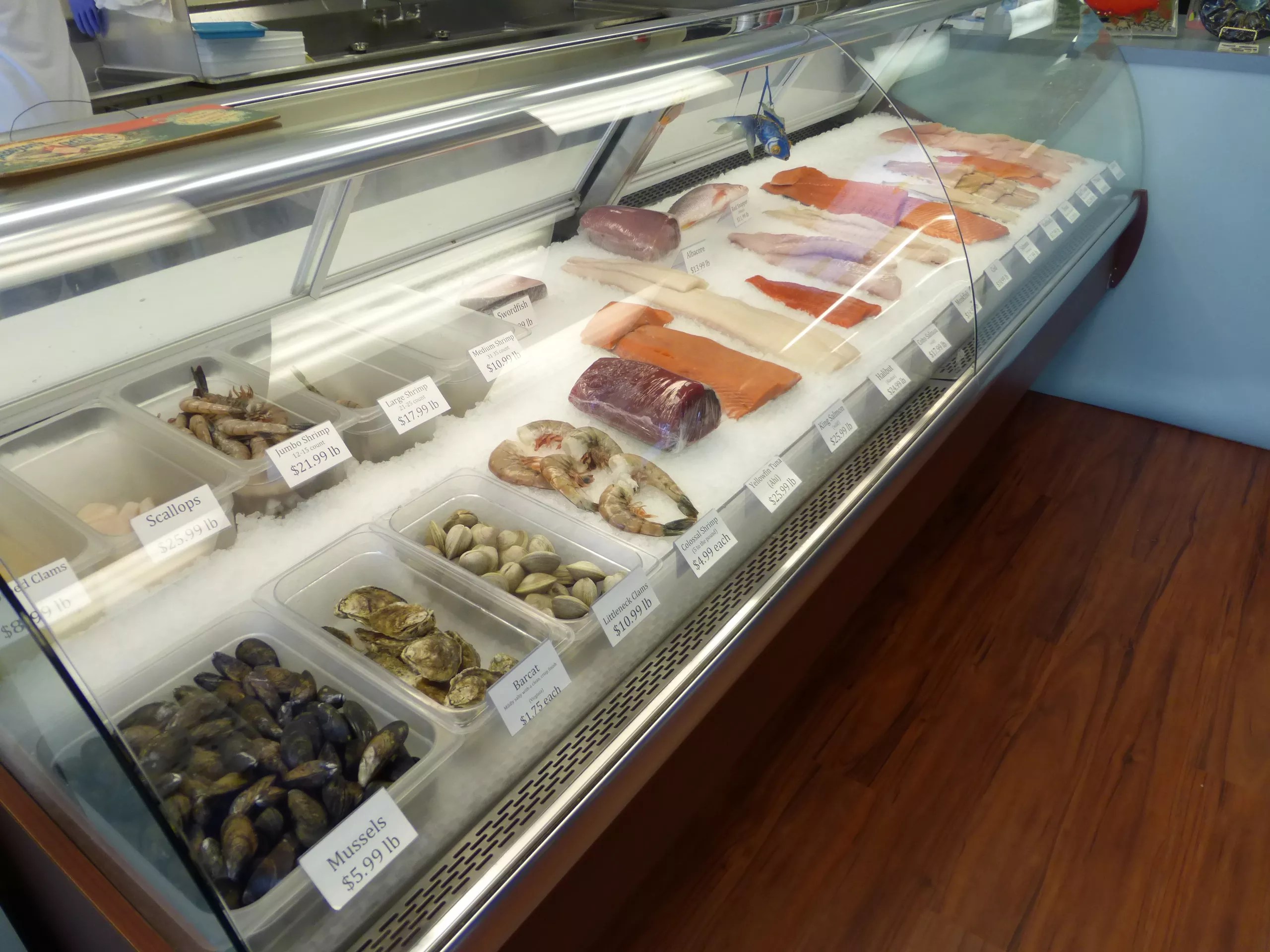 One of their first orders of business was to remodel and redecorate the store, which now includes a large-screen monitor showing customers a list of products not visible in the fresh case. The store also sells a bevy of pantry items and other packaged goods, many of which are locally made, that enhance the fresh-seafood selection.
