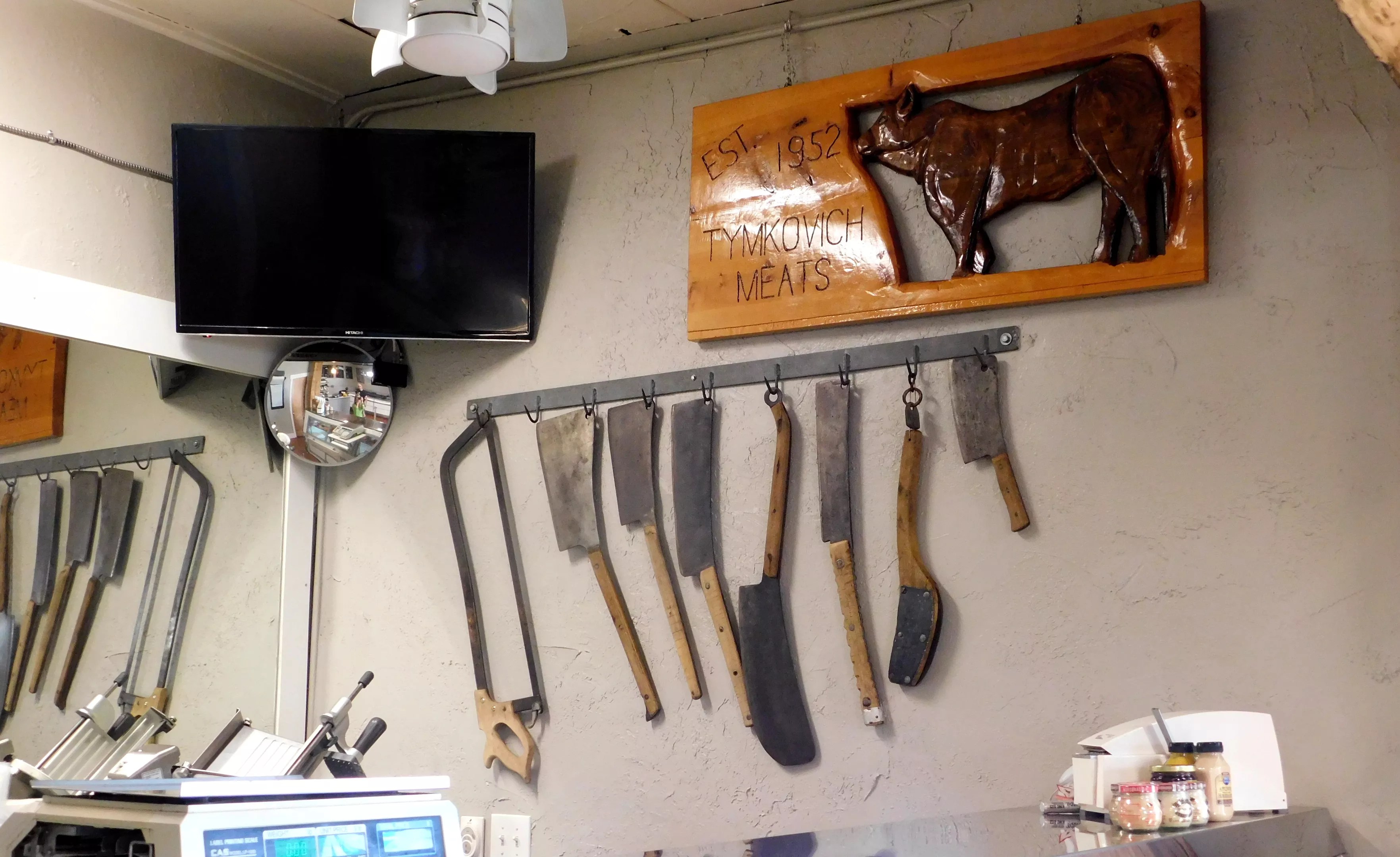 Knives once used by Bill Tymkovich on display above the butcher counter.