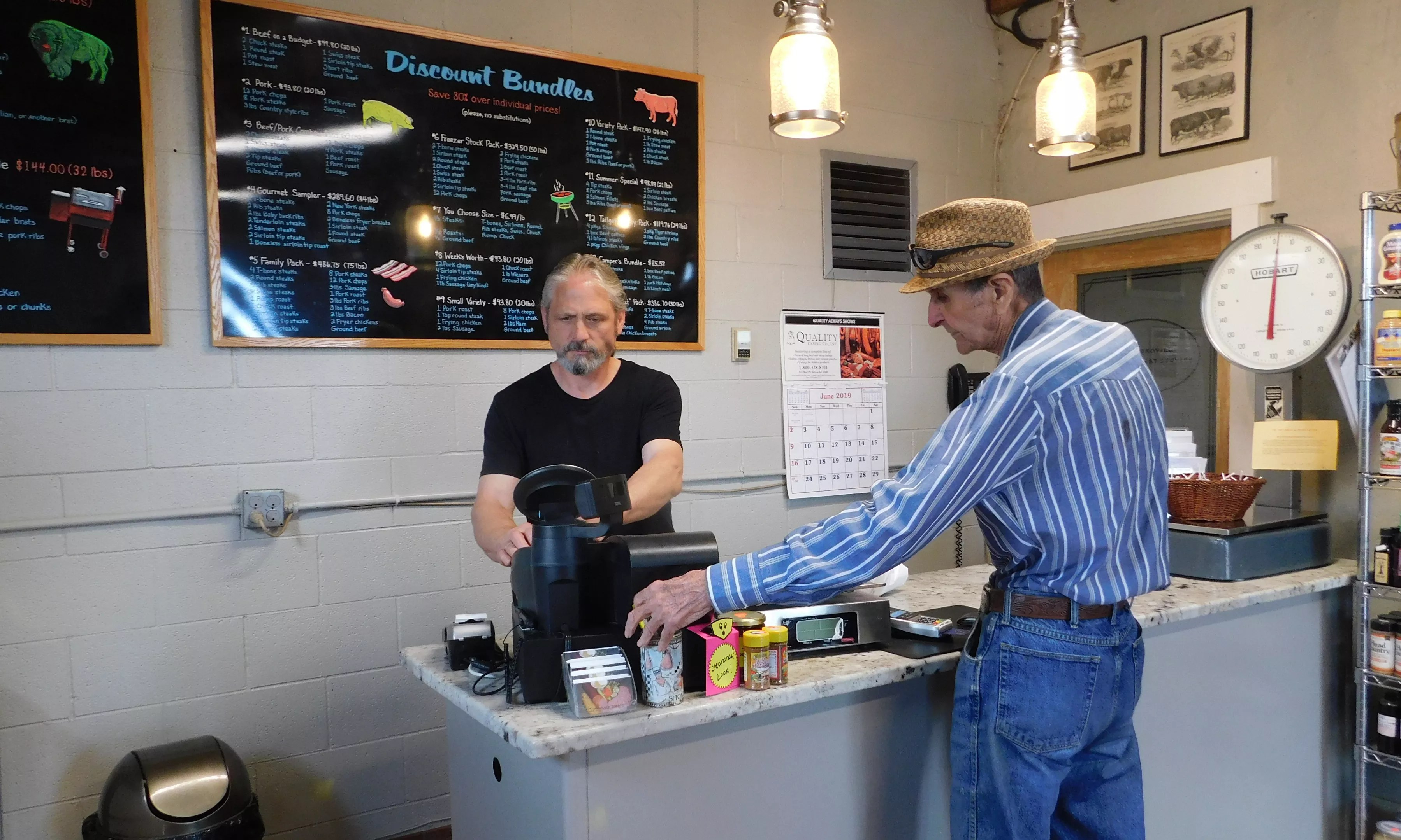 In 1951, Bill learned of a meat plant that was for sale; he bought it for $9,000, and the family business has been in the same spot ever since. The building has been added to and improved over the years, although a walk-up window where people could order meat is no longer there, covered over by a display of impressive-looking knives and blades that belonged to Bill.