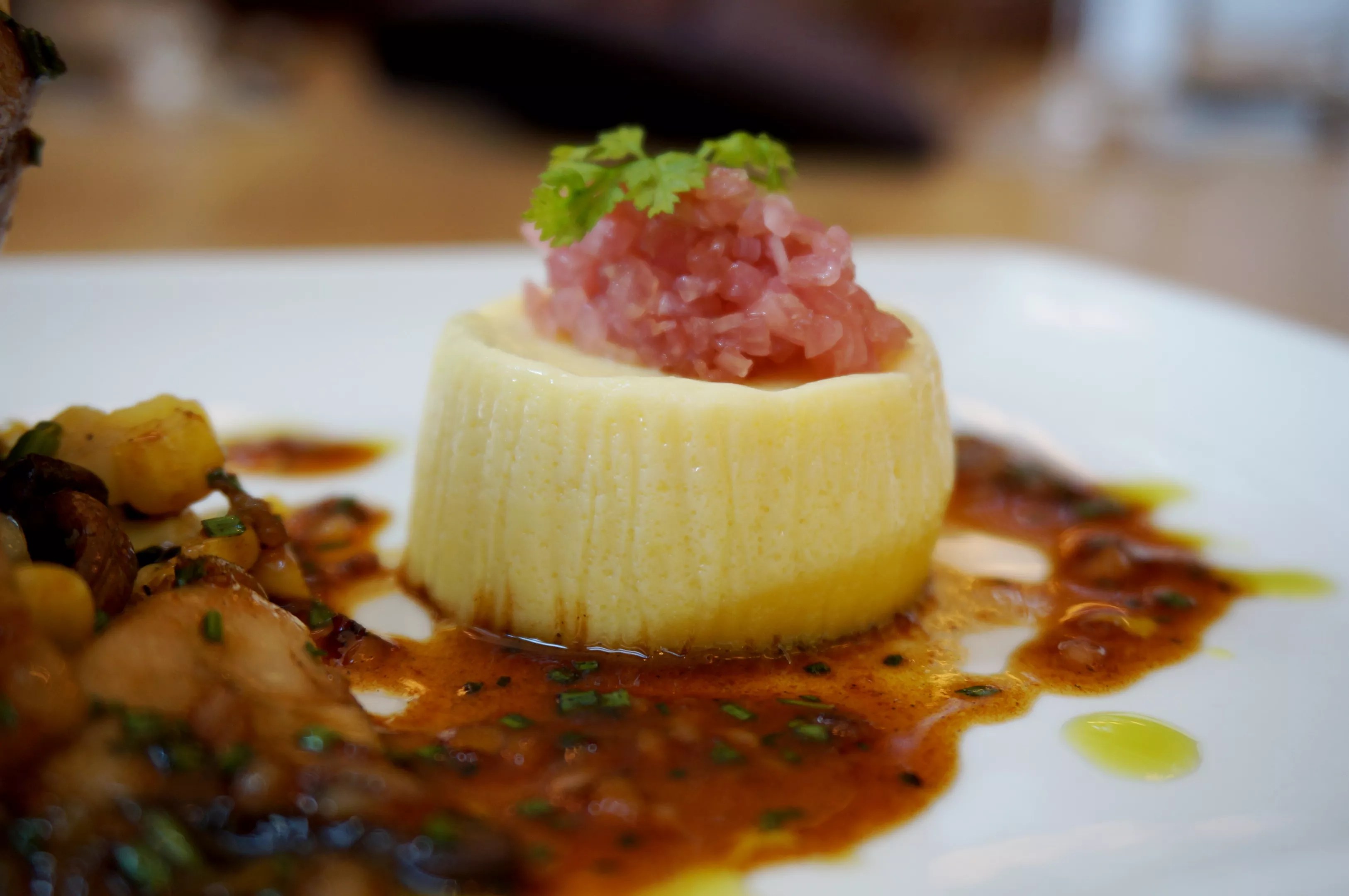 Corn custard graces a plate of beef sweetbreads.