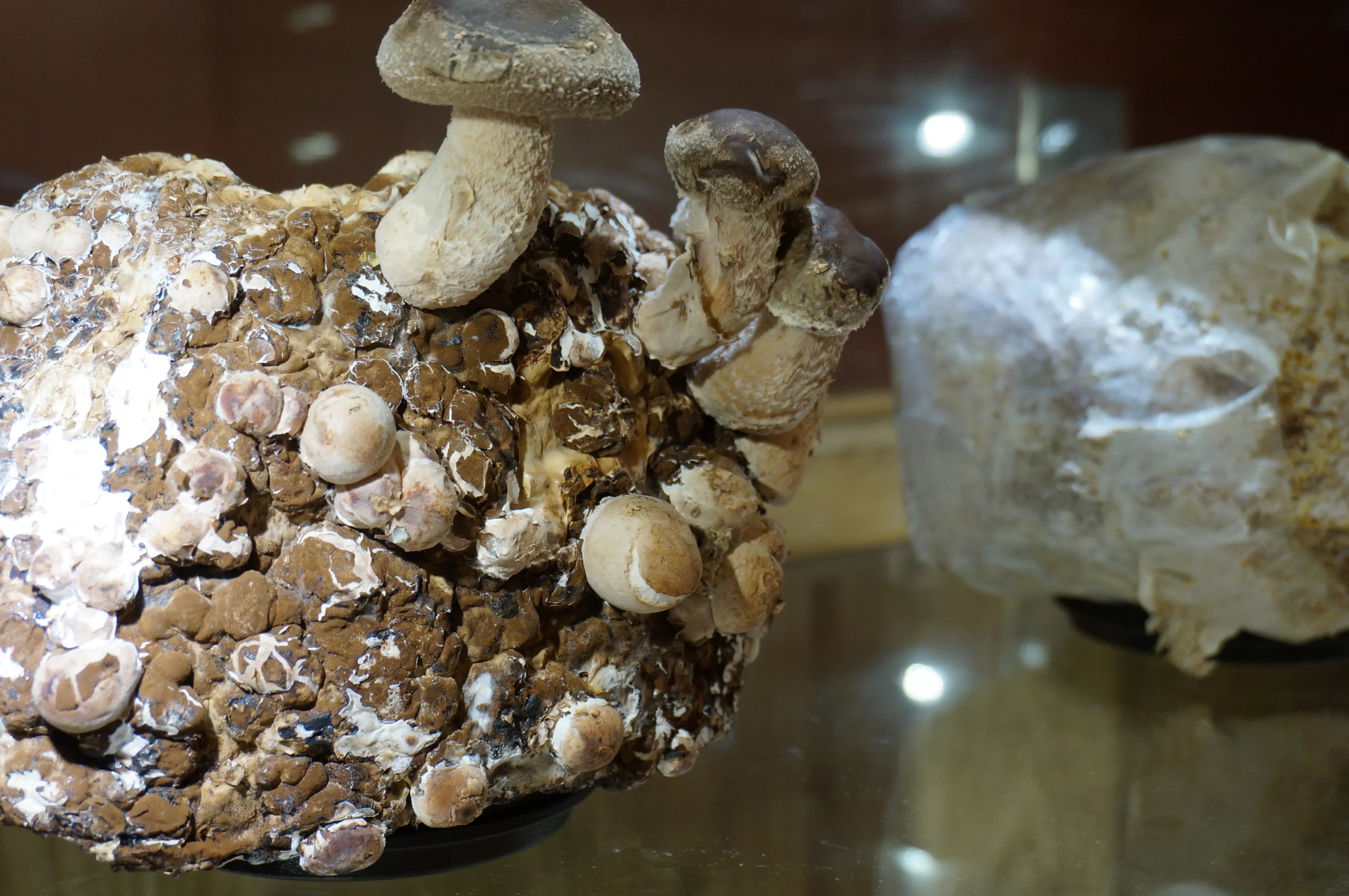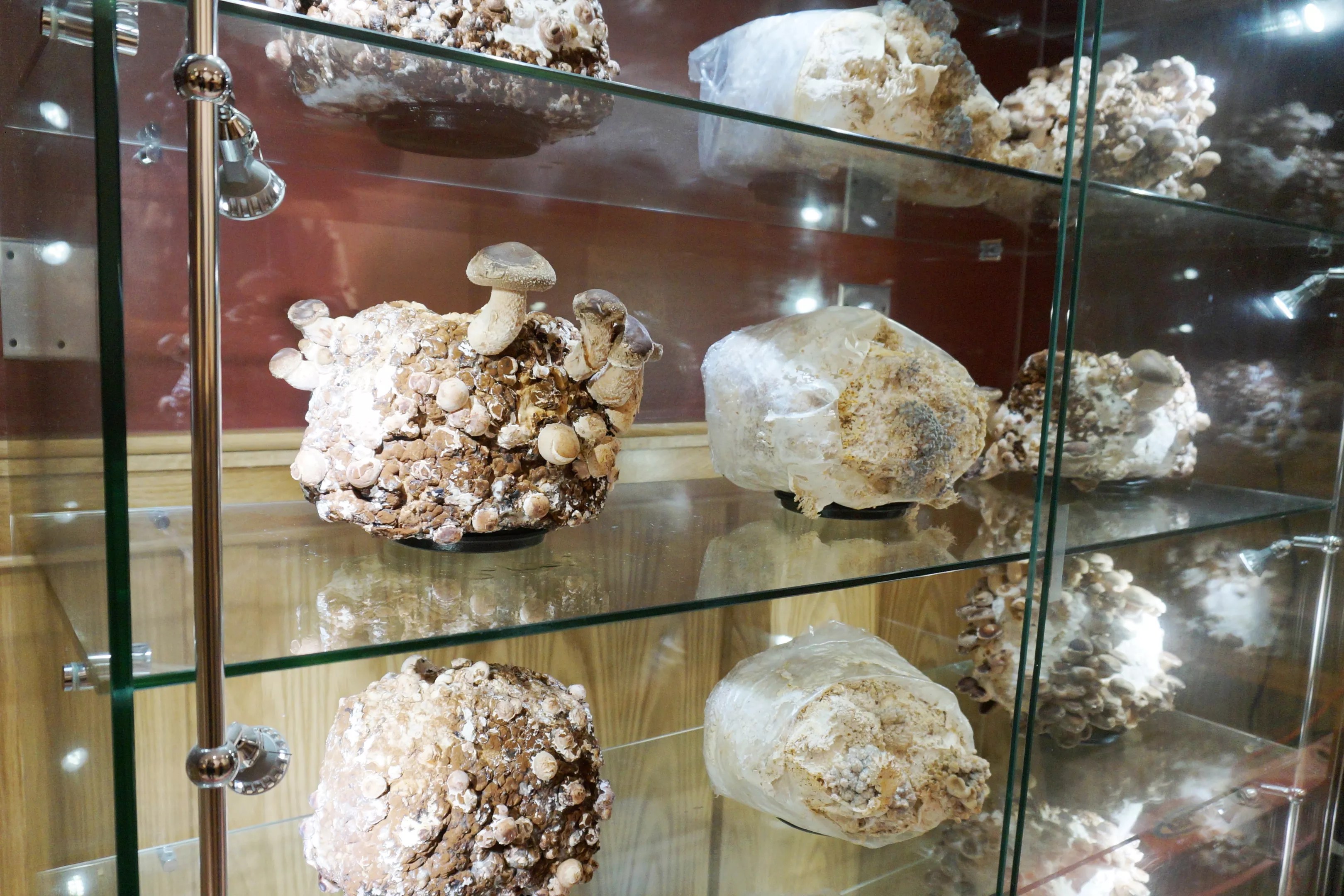 Hazel Dell mushrooms grow in a terrarium.