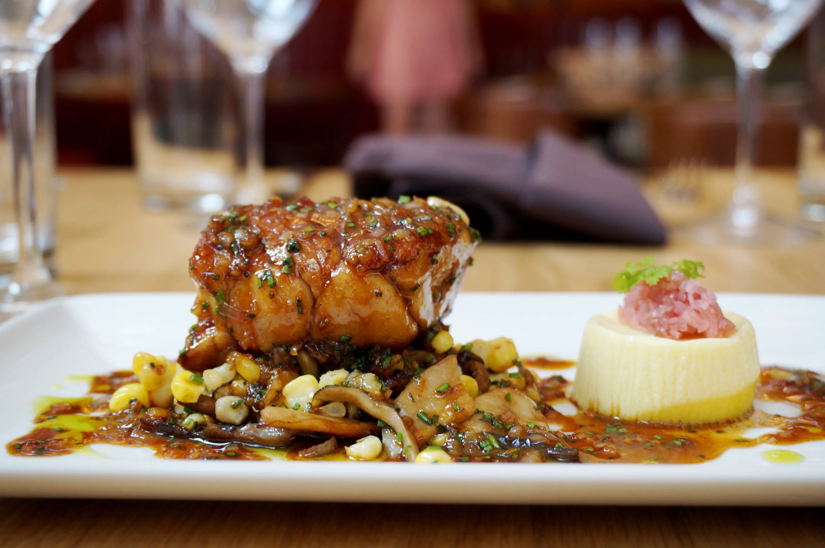 Beef sweetbreads with mushrooms, sweet corn, corn custard, pickled shallots and chicken jus.