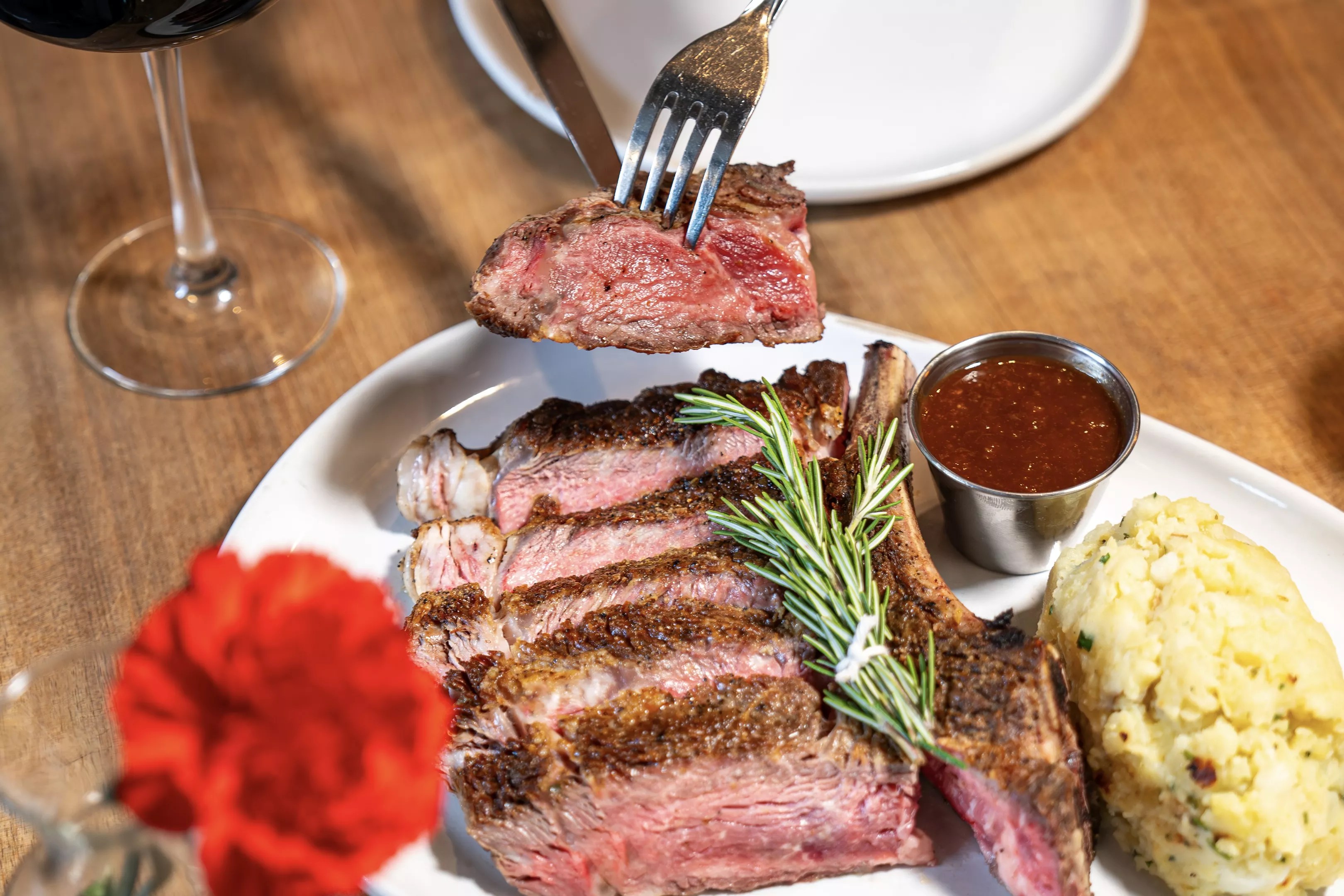 The $125 three-course menu at this French-Vietnamese restaurant starts with your choice of pan-seared chicken dumplings, a crispy shrimp and pork roll, a beet salad or raw bar delicacies including hamachi crudo and spicy yellowfin tuna tartare. Signature dishes like shaking beef and lemongrass chicken make up the main course selections. Dessert is a trio of Valrhona chocolate crémeux with raspberry-almond frangipane, a tartelette served with a chocolate-covered strawberry and finally, yuzu lemon curd topped with almond streusel. A fresh rose for every guest completes the experience. Book reservations on its website.