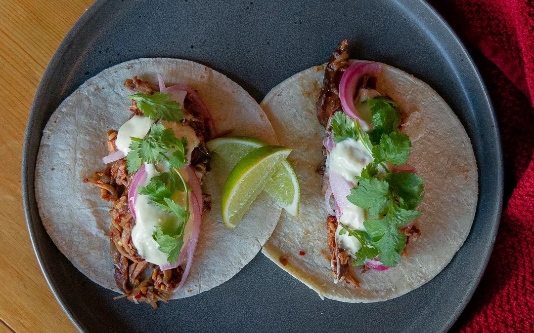 Hella Herbivore’s char siu jackfruit tacos are packed with shredded jackfruit roasted in a Chinese barbecue marinade and topped with pickled red onions, cilantro and dairy-free sour cream.