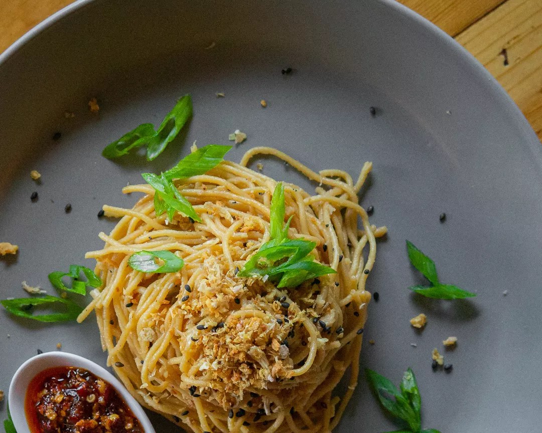 For an extra-spicy kick, the garlic noodles are served with an optional spoon of Sichuan chili oil.